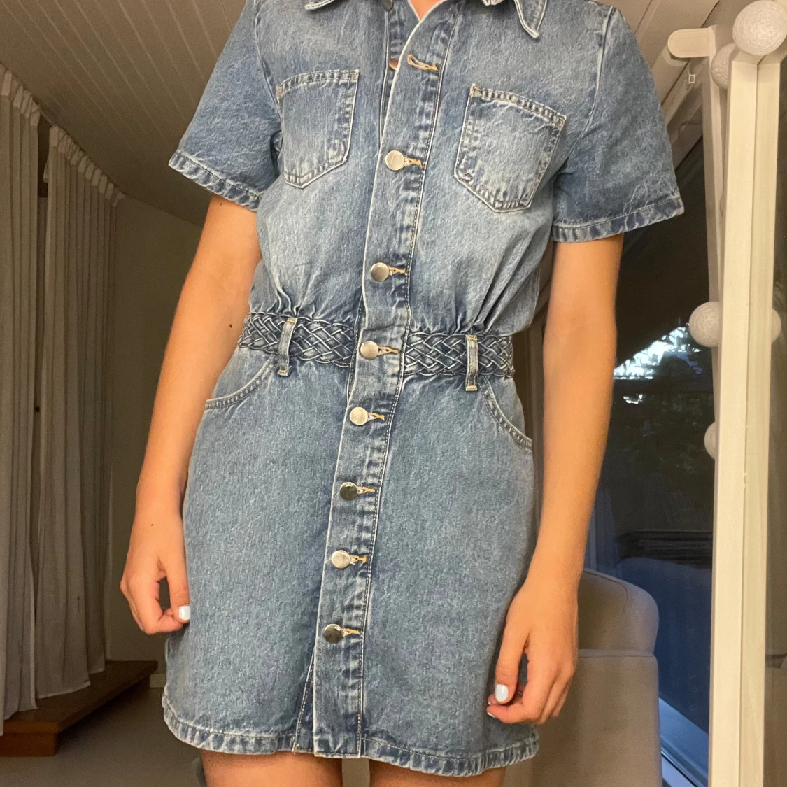 Snygg jeansklänning i blå denim med kort ärm, knappar hela vägen framtill och två bröstfickor. Midjan markeras av ett flätat bälte i samma material. Klassisk krage och avslappnad passform, perfekt för en cool och avslappnad look.