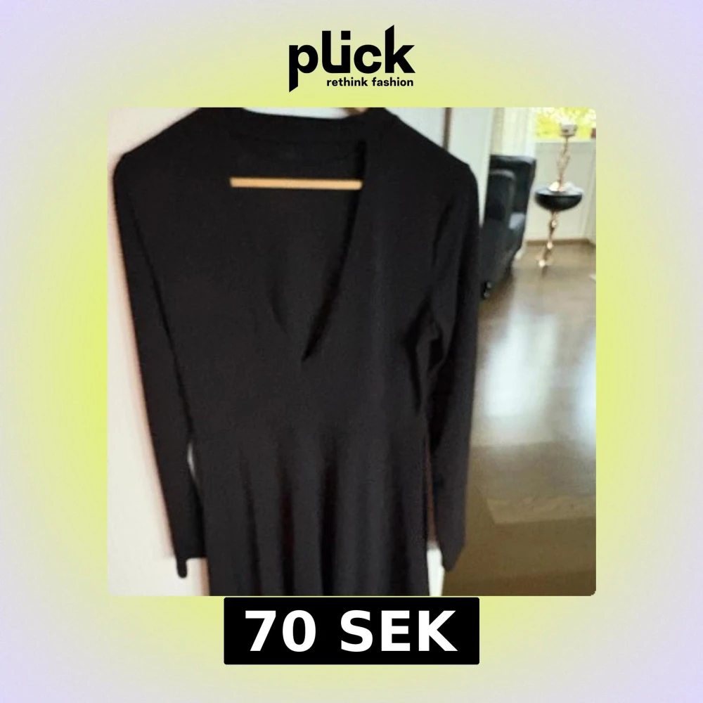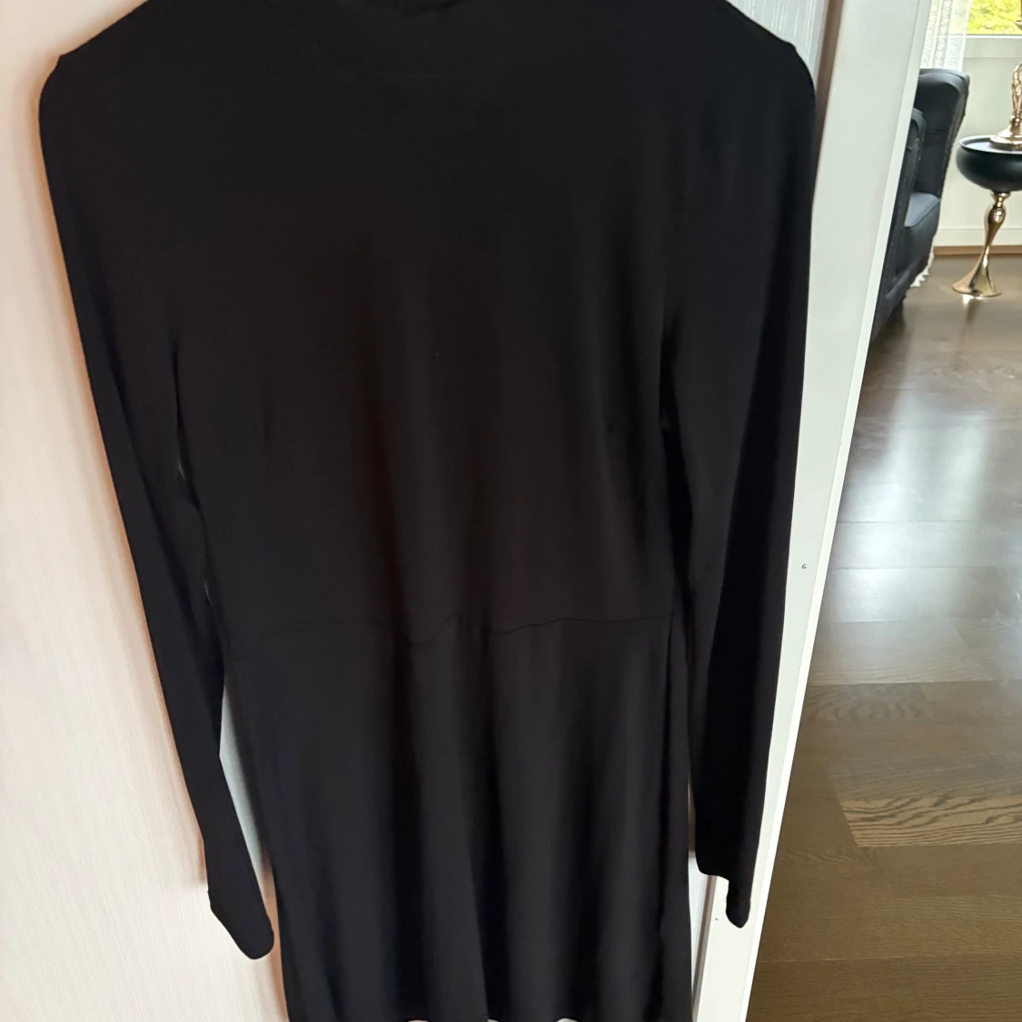 En stilren svart klänning med lång ärm och snygg v-ringning. Modellen är enkel och tidlös med lätt utställd kjol, perfekt för dig som gillar minimalistisk stil. Materialet känns mjukt och följsamt mot kroppen.