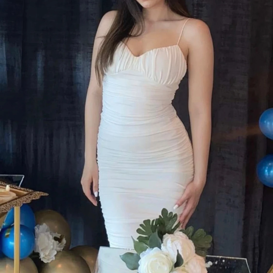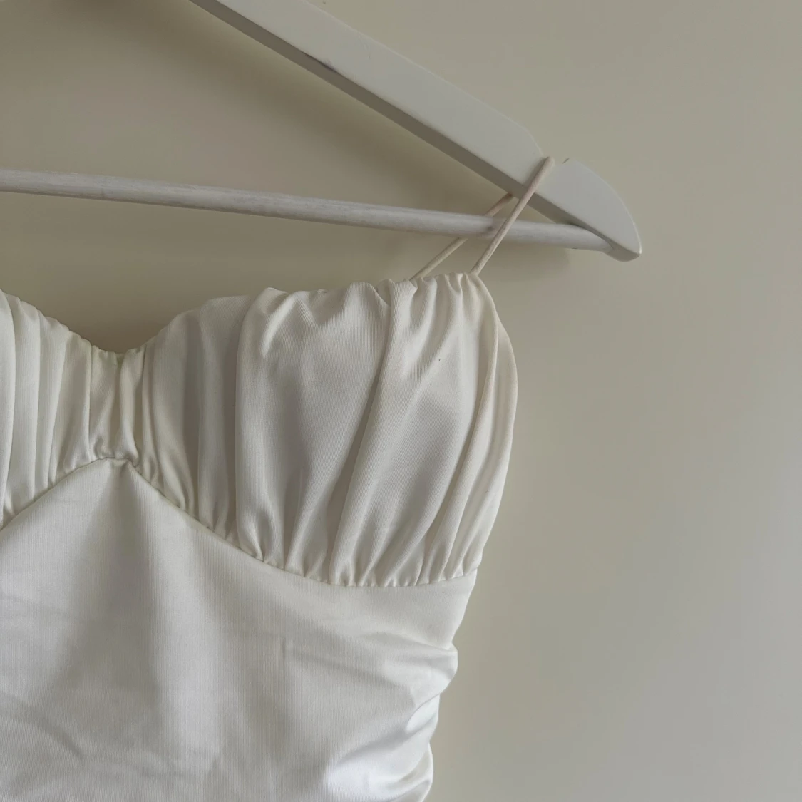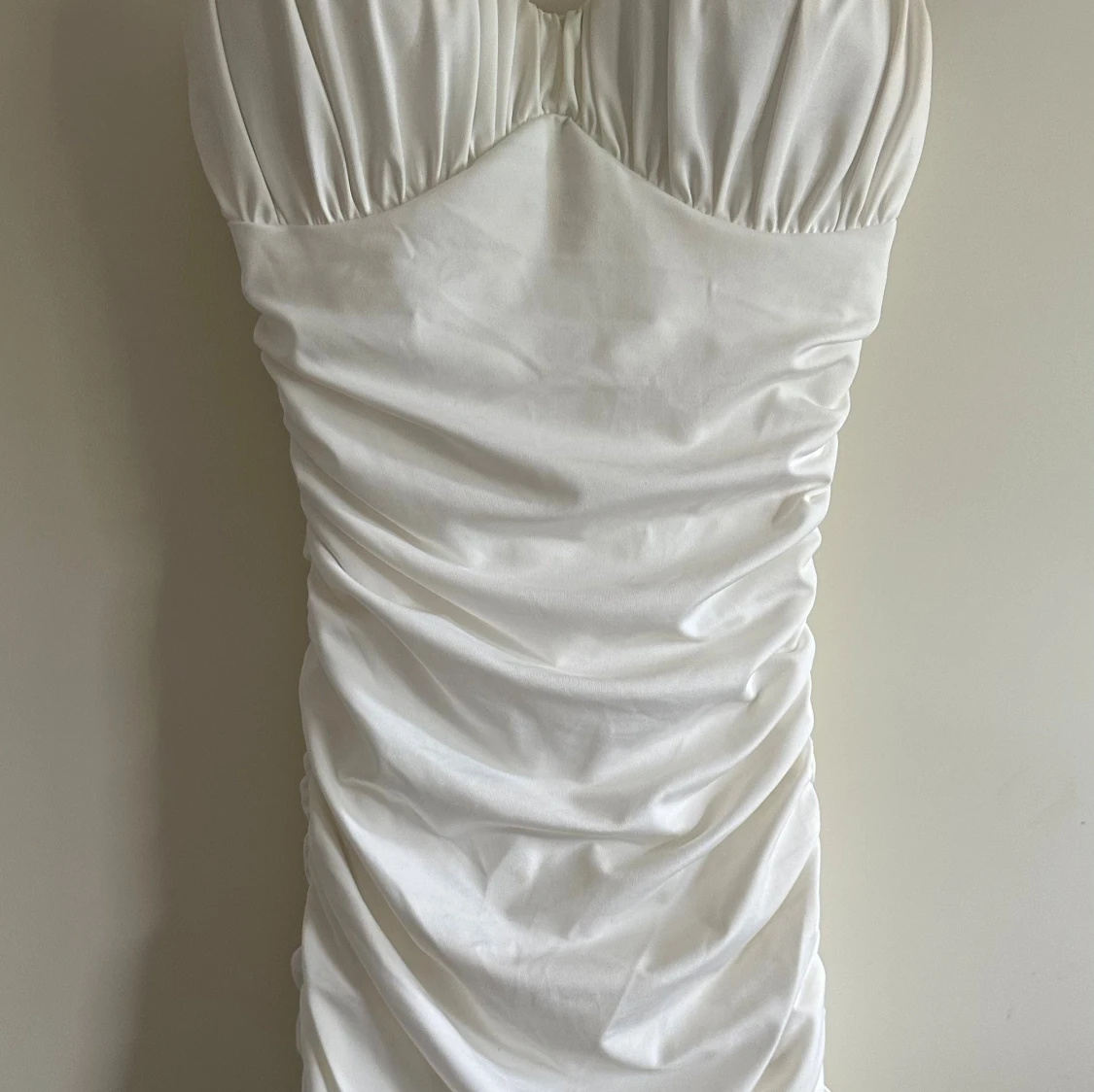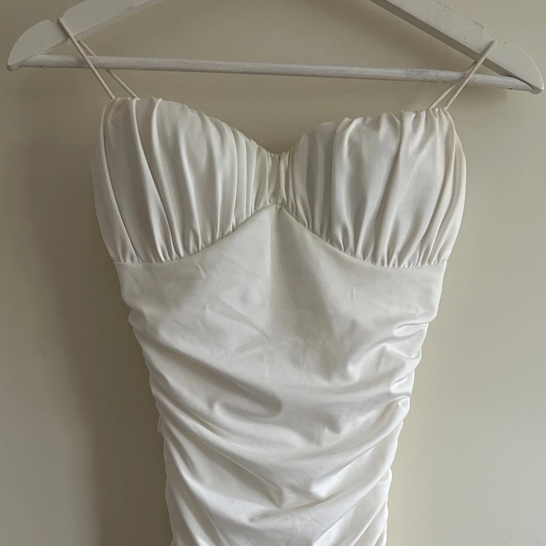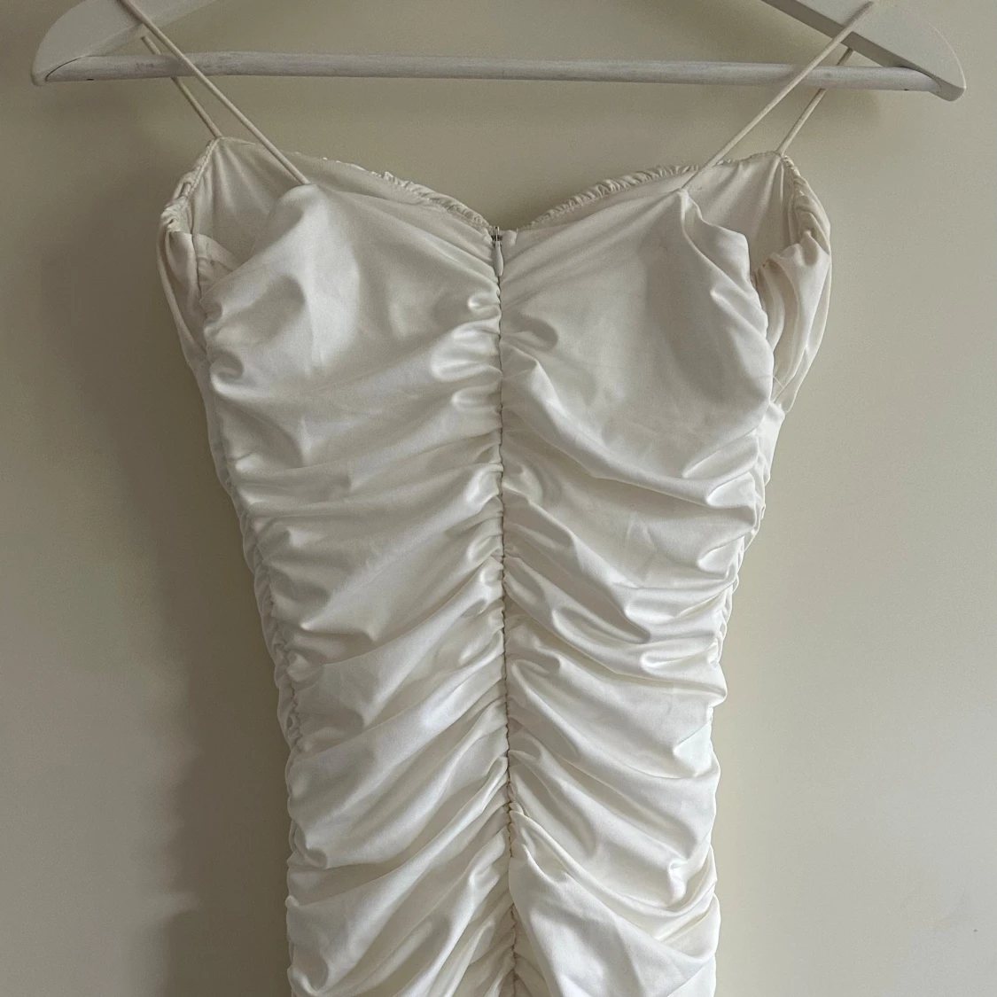 Supersnygg vit klänning med tunna axelband och draperad effekt över hela klänningen. Sitter figurnära och har en söt omlottdetalj vid bysten. Perfekt för dig som vill ha en stilren och fräsch look. Materialet känns mjukt och har en lätt glans. Perfekt studentklänning