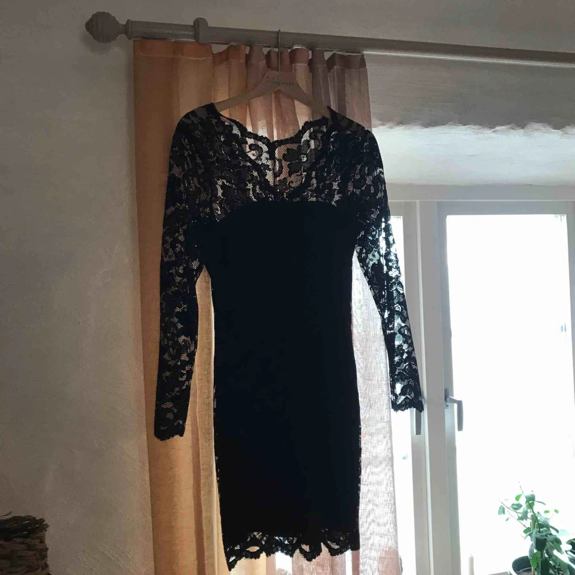 Färg: svart Yttertyg: 95% nylon, 5% elastan Foder: 100% polyester. Tvätt: 40° skontvätt. Spetsklänning med v-ringning fram, fodrad, i stretchig kvalité. Längd från axel bak 91 cm, byst 80 cm i strl S. Är i fint skick men flitigt använd