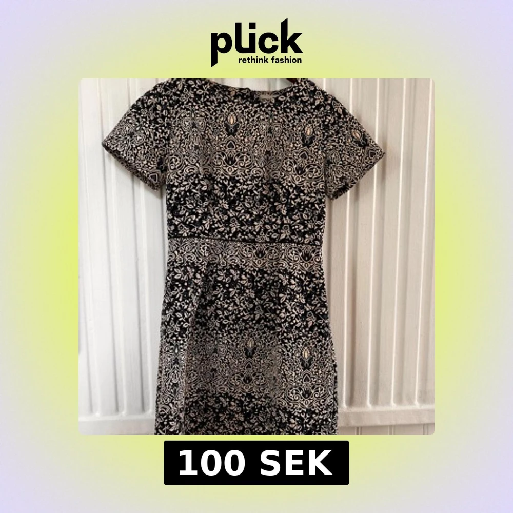 Säljer en elegant mönstrad klänning från H&M i svart och beige jacquardvävd med blommönster. Klänningen har korta ärmar och en rund halsringning. Perfekt för en stilfull look!