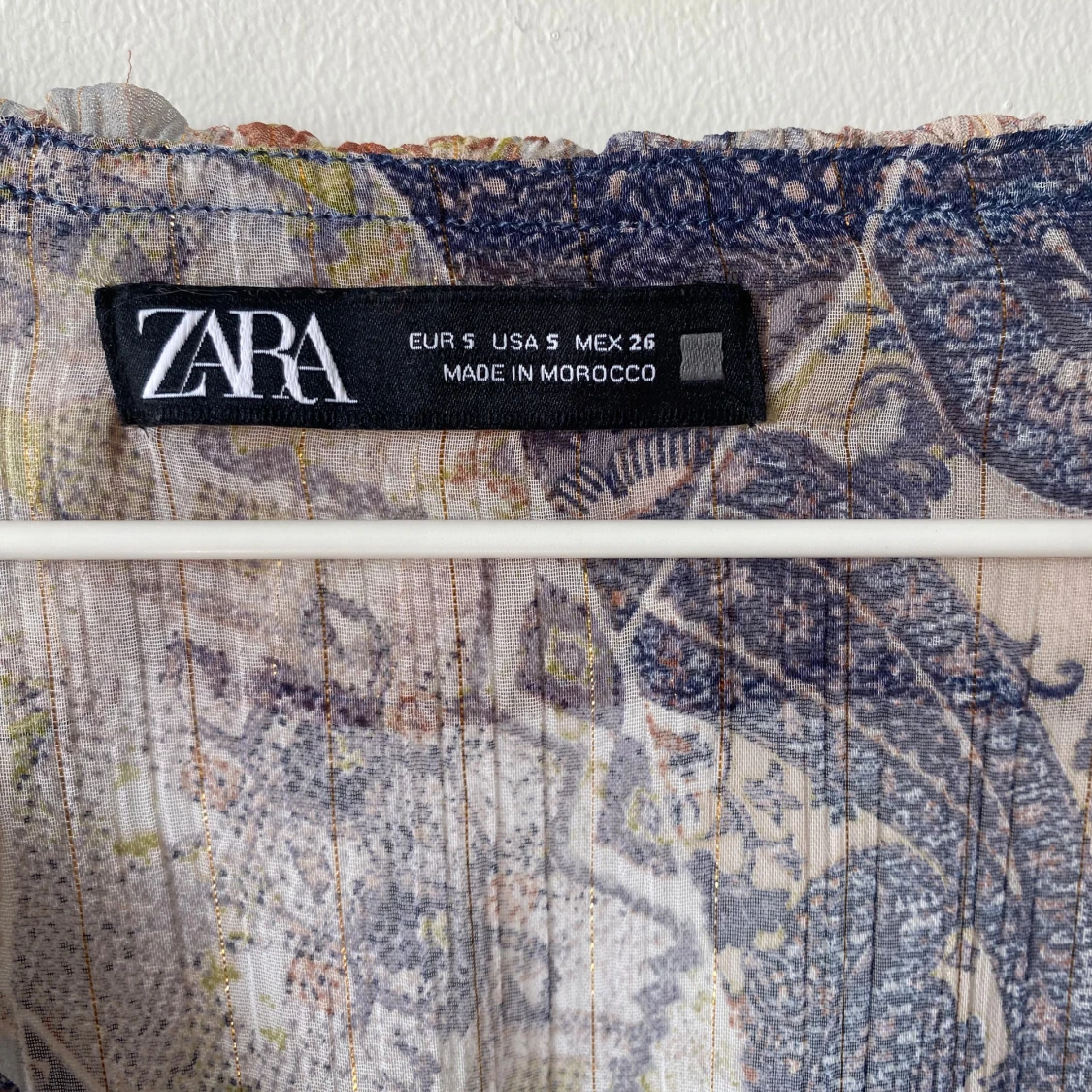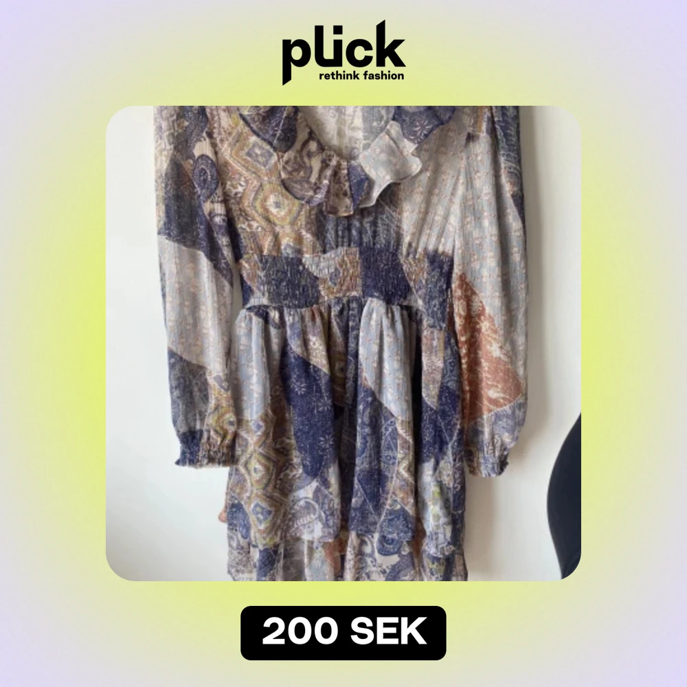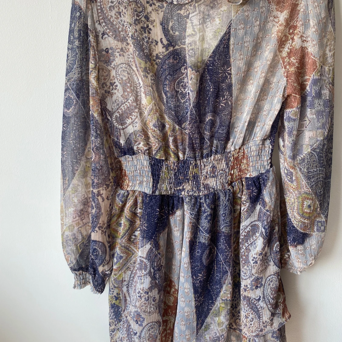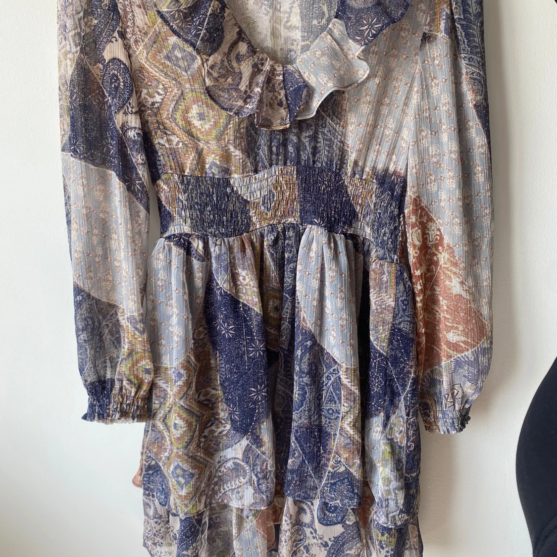 Säljer en superfin mönstrad klänning från Zara. Den har ett bohemiskt mönster i blå, beige och bruna toner. Klänningen är långärmad med volangdetaljer vid halsen och en smockad midja som ger en fin passform. Perfekt för både vardag och fest!