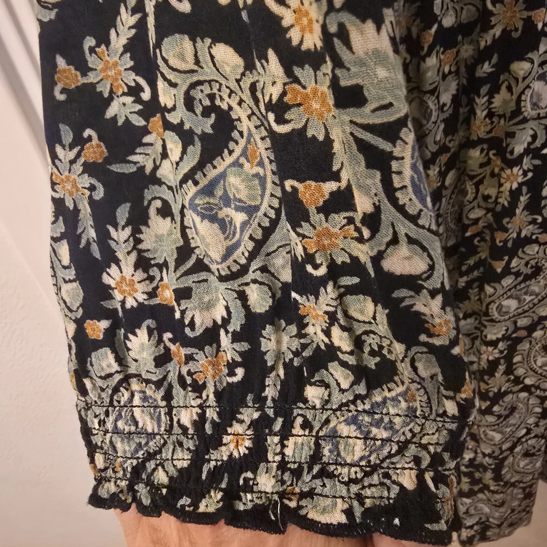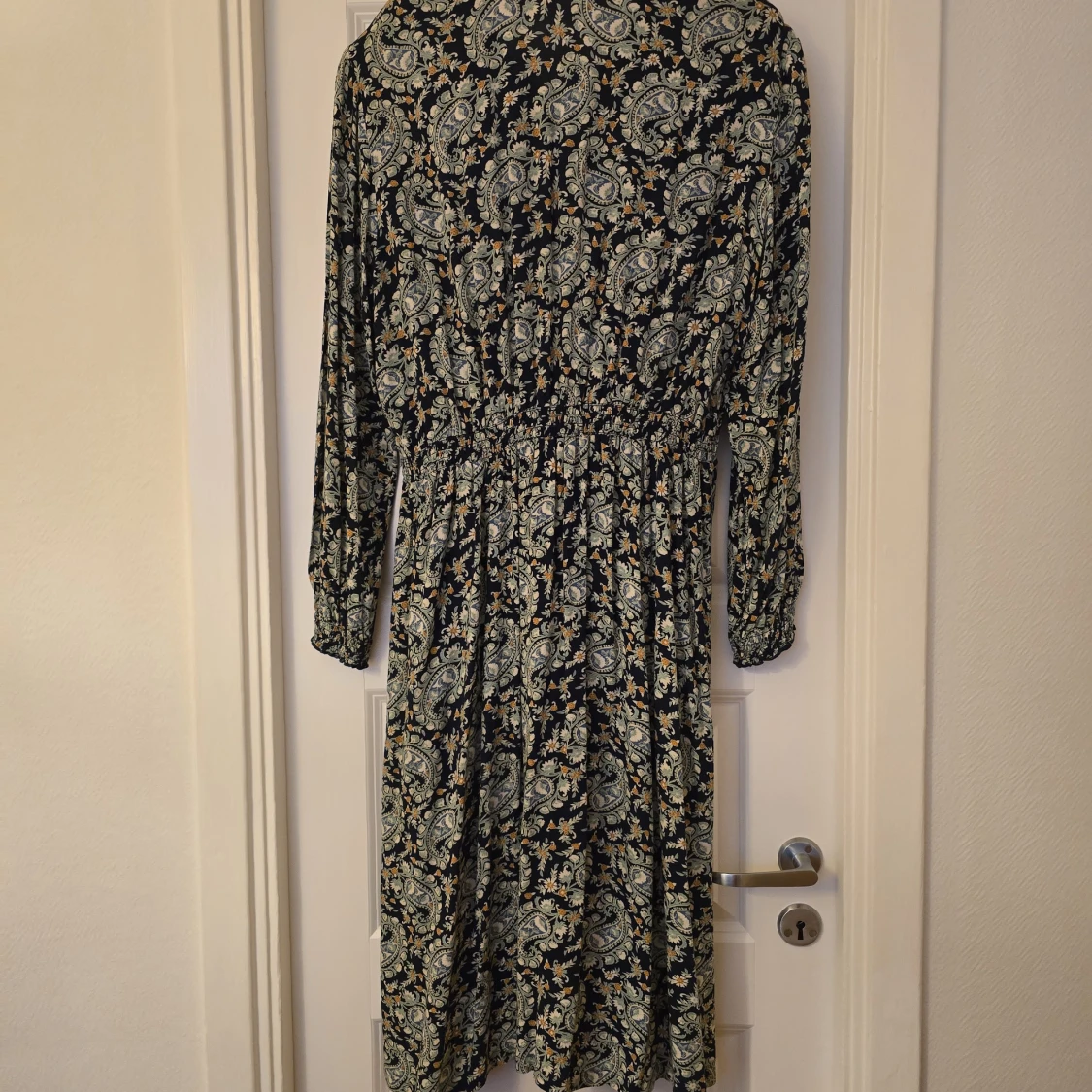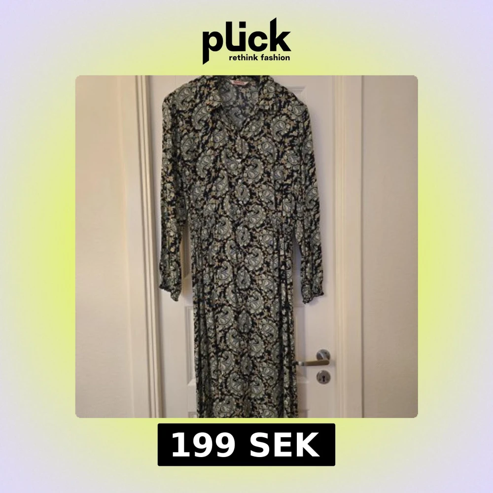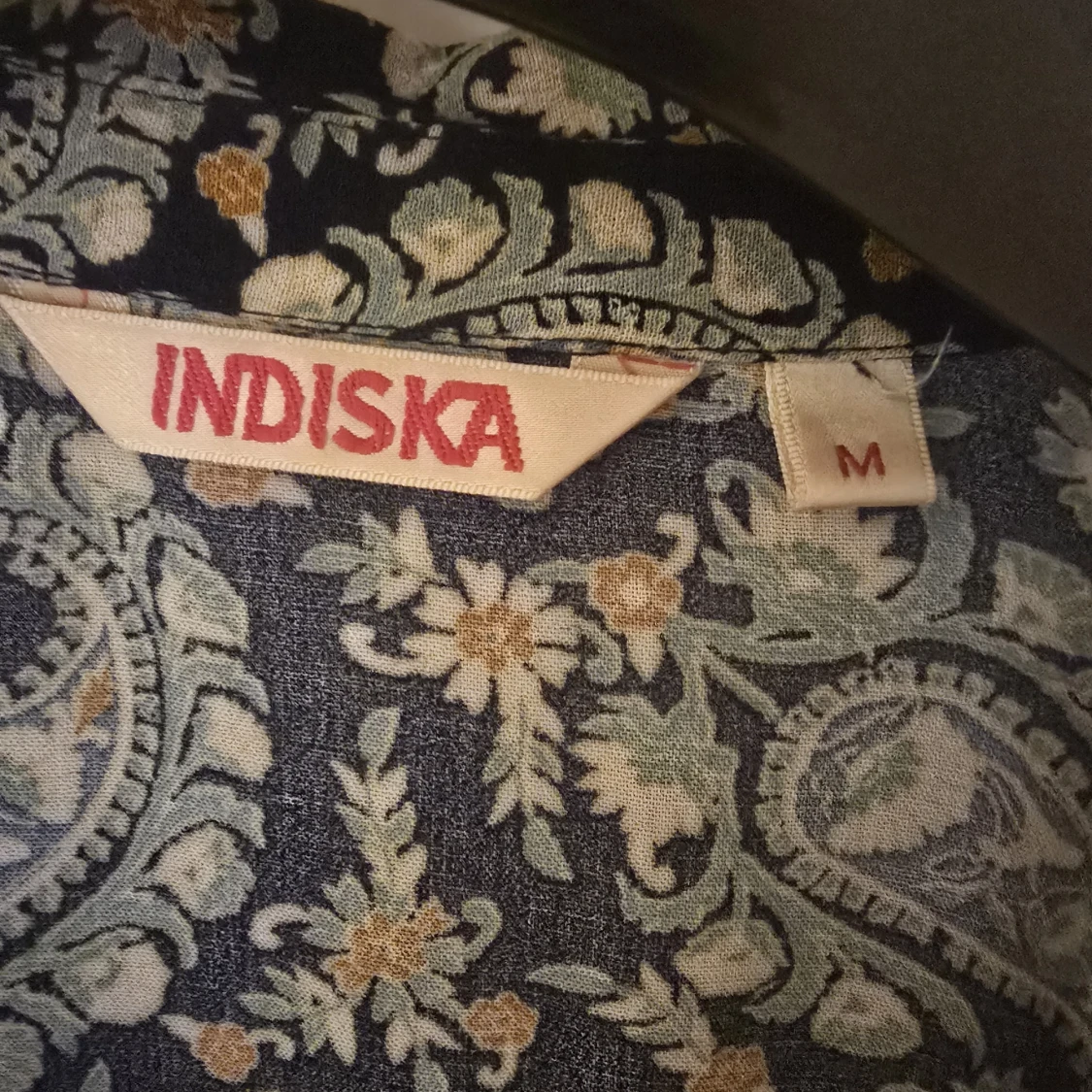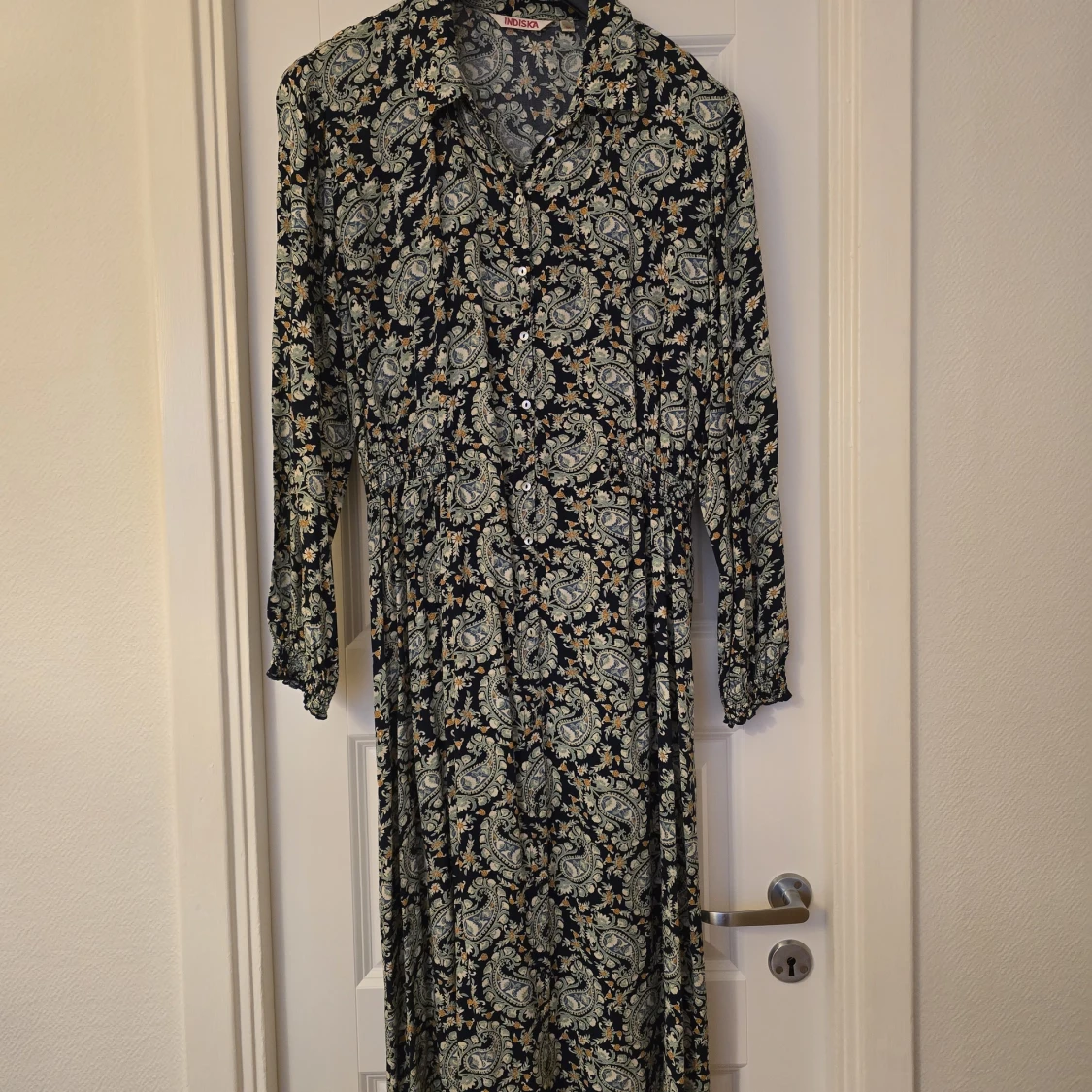 Säljer en långklänning från Indiska med blommigt mönster i blått, beige och grönt. Klänningen har lång ärm med resår vid ärmslut, krage och knappar framtill. Perfekt för dig som gillar bohemisk stil.