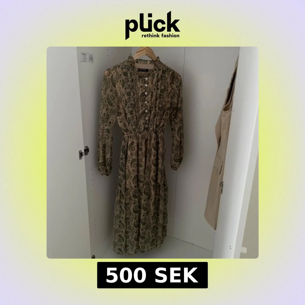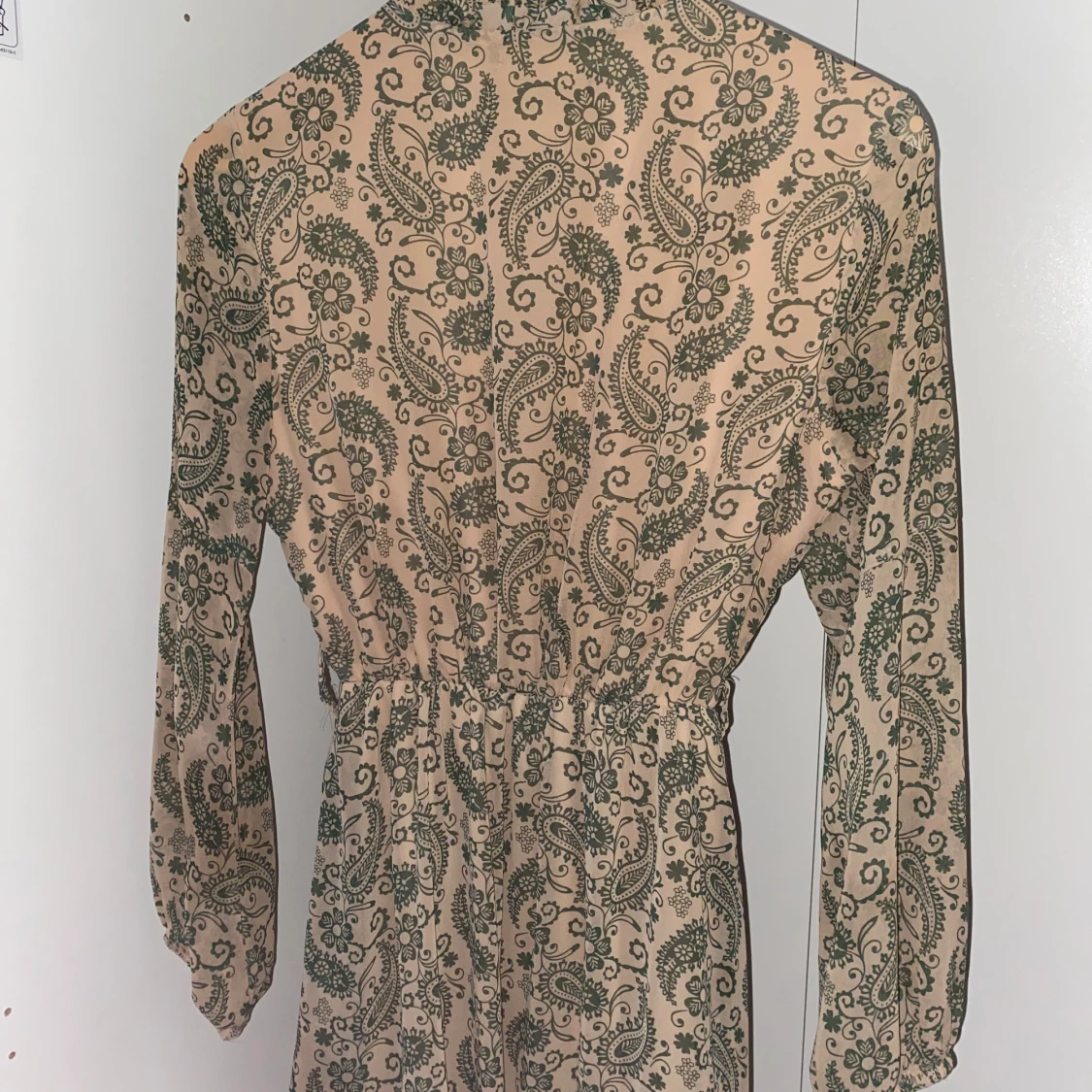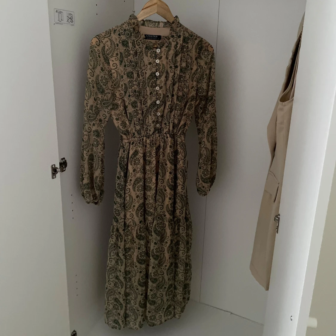 Säljer en elegant långklänning från Lighter med ett intrikat grönt mönster på beige bakgrund. Klänningen har långa ärmar och knappar framtill, vilket ger en klassisk look. Perfekt för en stilfull dag eller kväll.
