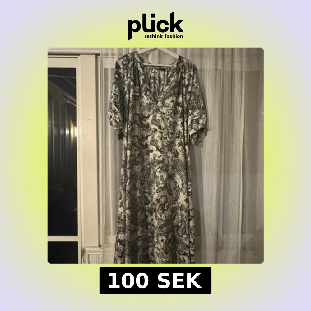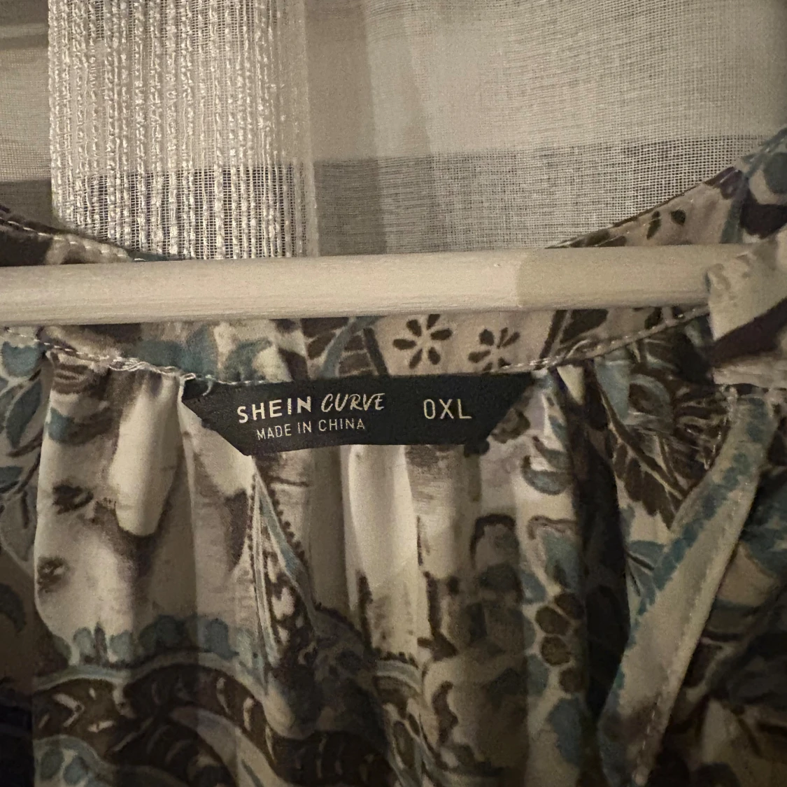 Långklänning från SHEIN Curve med v-ringning och korta ärmar. Klänningen har ett paisleyinspirerat mönster i blått, grått och beige på vit botten. Luftig passform och perfekt för dig som gillar bohemisk stil.