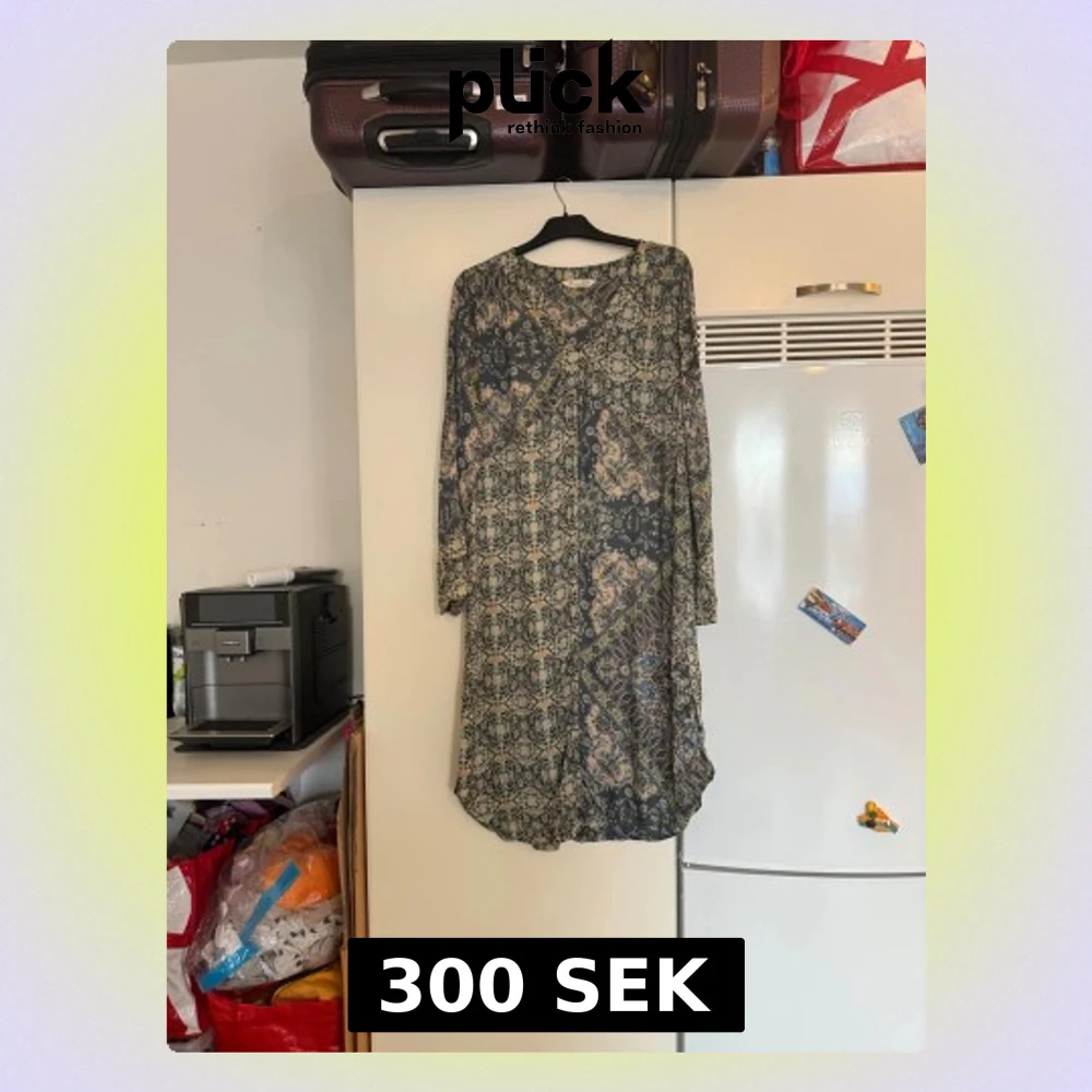 Säljer en superfin klänning med v-ringning och långärmade ärmar. Klänningen har ett detaljerat blommigt mönster i blått, beige och grönt. Materialet är mjukt och följsamt, perfekt för dig som gillar boho-vibe och snygga prints. Från märket Odd Molly. Storlek 2 som enligt deras storleksguide motsvarar en M. Mycket fint skick, jag hittar inga synliga anmärkningar eller defekter.