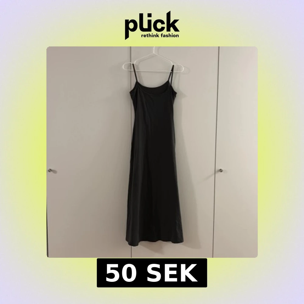 Svart långklänning med smala axelband och rundad halsringning. Klänningen har en enkel och stilren design som faller rakt ner och ger en snygg siluett. Materialet ser ut att vara mjukt och följsamt, oanvänd