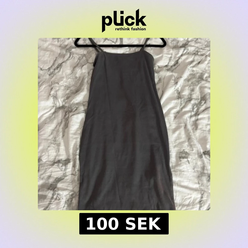 Säljer en enkel och stilren mörkgrå ribbad klänning. Klänningen har smala axelband och en rak, kroppsnära passform. Använd 1 gång