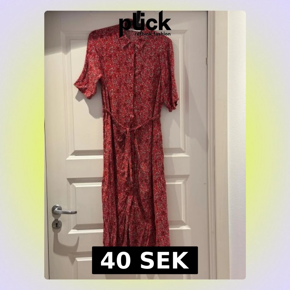Röd midilång klänning från NA-KD med små blommor, knappar hela bägen och knytskärp i midjan. Klänningen har korta ärmar och klassisk krage, perfekt för vår och sommar. Klänningen har även fickor. Storlek 38 men oversize.
