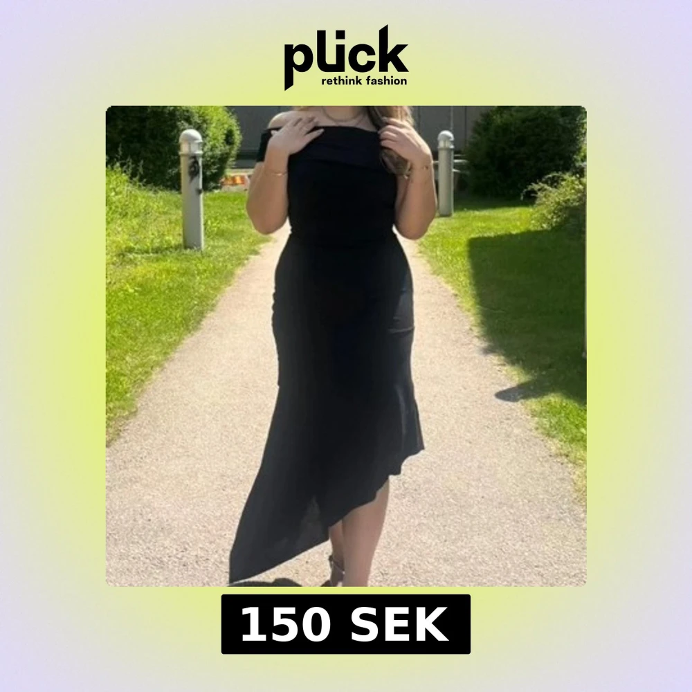 Snygg svart långklänning med offshoulder-design och asymmetrisk nederdel. Klänningen har en figurnära passform. Den är stretchig i materialen och endast använd en gång 💕