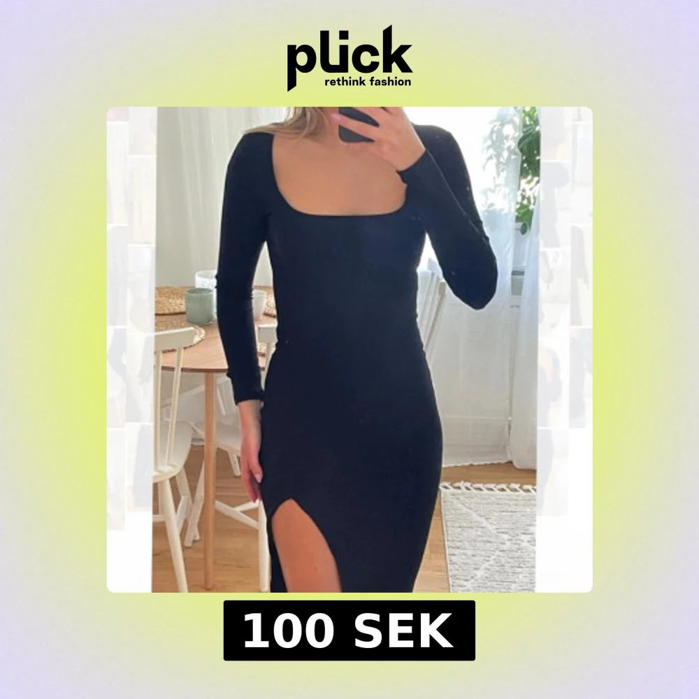 Snygg svart långärmad klänning med fyrkantig urringning och slits. Klänningen är figurnära i ribbat material. Strl S.