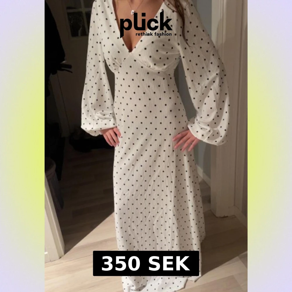 Superfin vit maxiklänning från NA-KD med svarta prickar, ballongärmar och djup v-ringning. Klänningen har öppen rygg med knytband i nacken och ett flowy fall. Perfekt för dig som vill sticka ut med en elegant och trendig look.