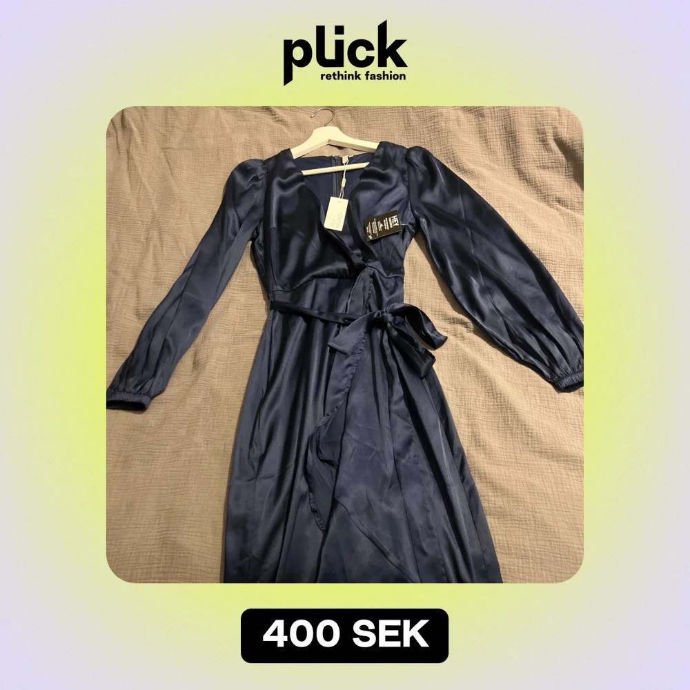 Säljer en elegant mörkblå omlottklänning i siden med långa ärmar och knytband i midjan. Perfekt för festliga tillfällen eller en fin middag. Klänningen har en v-ringad hals och ger en lyxig känsla. Passar bra till både höst och vinter. Klänningen kommer ifrån NELLY.COM och är helt ny med alla lappar kvar. (Köparen står för frakt)