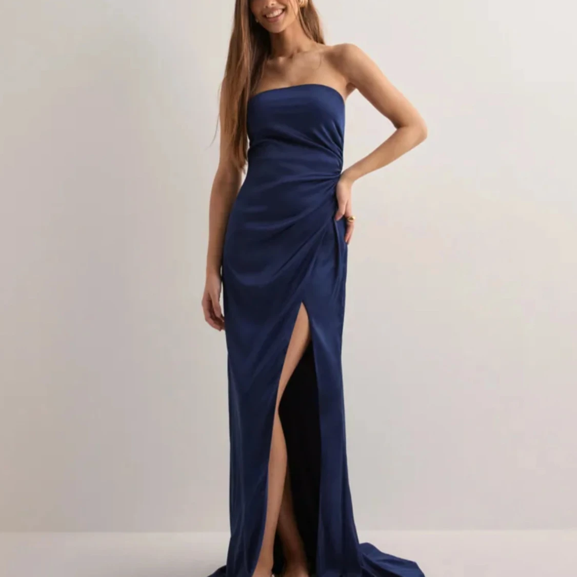Säljer en marinblå axelbandslös långklänning med snygg drapering i midjan och hög slits framtill från Nelly. Den är helt oanvänd å är inte ens uppackad, säljer då jag glömde lämna tillbaka den. Tveka inte vid frågor, kan absolut diskutera priset🥰🥰🥰