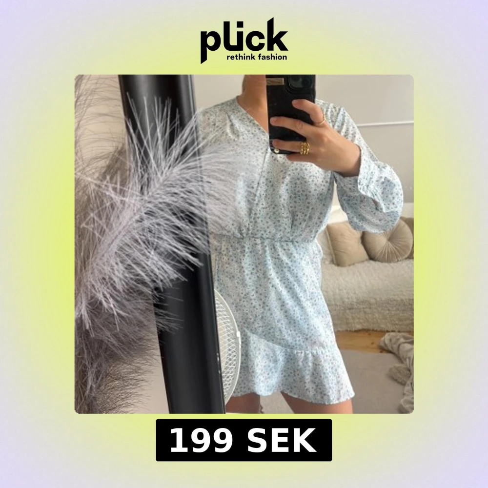 Supersöt ljusblå kortklänning med småblommigt mönster och v-ringning. Klänningen har långa ärmar, resår i midjan och volang nertill. Perfekt för vår och sommar, enkel att styla med sneakers eller sandaler.