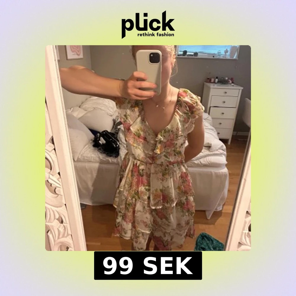Superfin blommig kortklänning i ljusa färger med rosa och gröna toner. Klänningen har volangdetaljer, v-ringning och öppen rygg med en tunn rem. Från nelly! Storlek 34