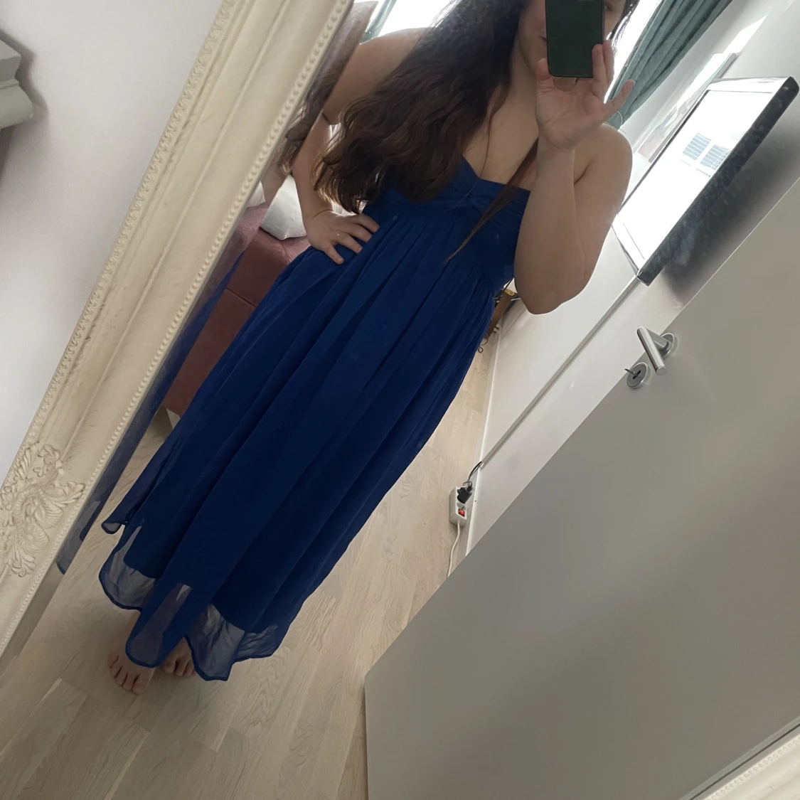Säljer min marinblå långklänning. Fortfarande mycket fint skick! Perfekt längd för någon som är 157-160 cm. Har använt den själv till diverse vårbaler under universitetstiden. Säljer på grund av att storleken nu är lite för liten för mig.