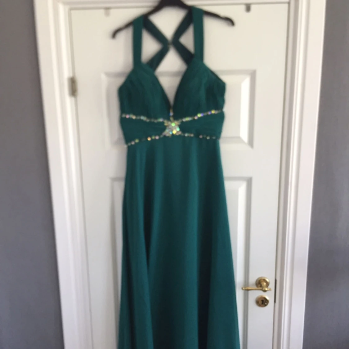 Grön långklänning endast använd en gång. Har korsade band i ryggen med hakar och även en dragkedja på sidan. Skickas med posten mot att köparen betalar frakten.