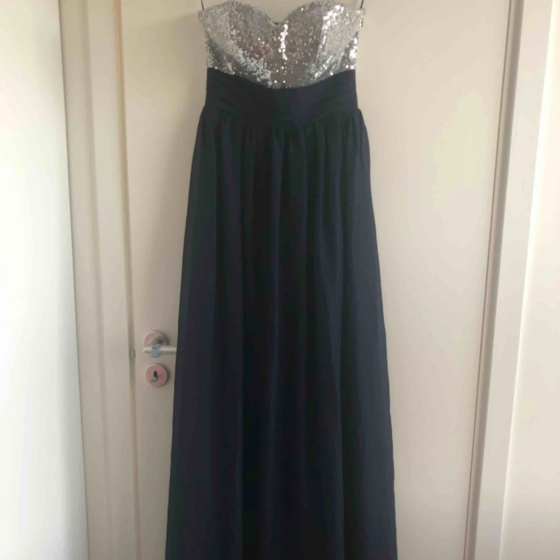 Mörkblå klänning med hjärtformad urringning och korsad rygg.. paljetter på både fram och baksida.. Helt ny med etiketten kvar ..