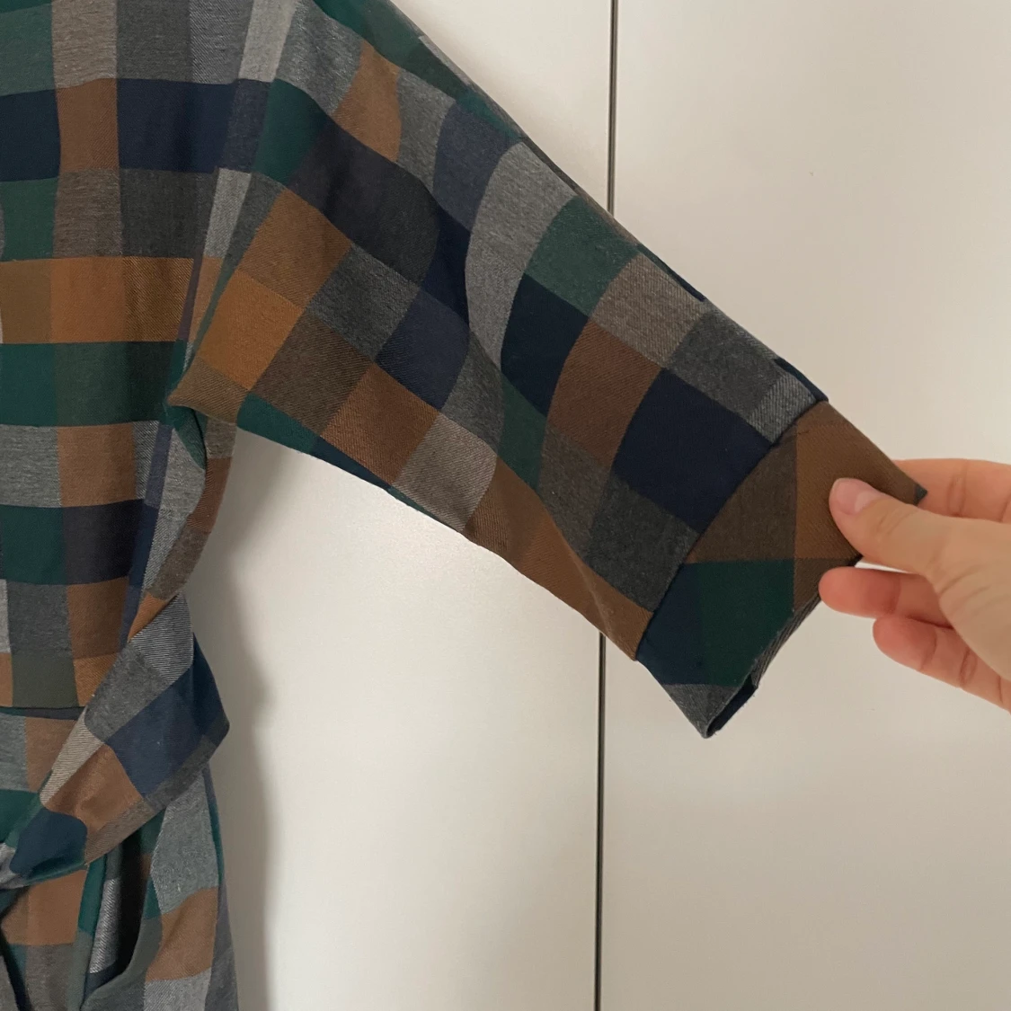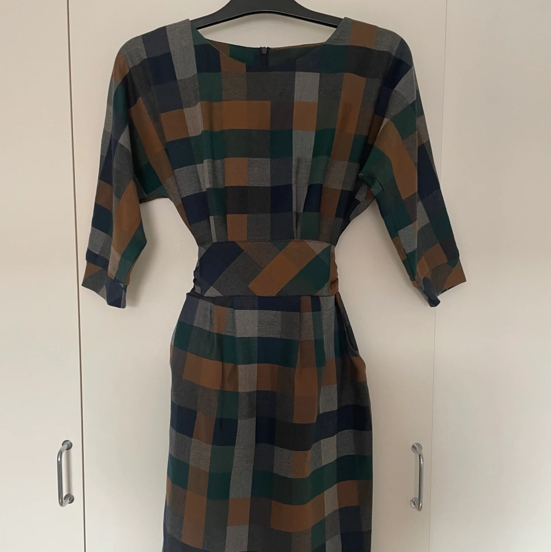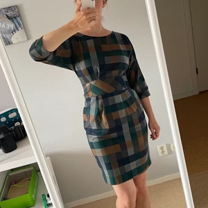 En rutig klänning med avslappnad arm och figurnära passform i midjan, innehåller ull. Passsr perfekt till höst/vinter. I fint skick. Längden 88 cm. Jag använder stlk 38 och är 172 cm.