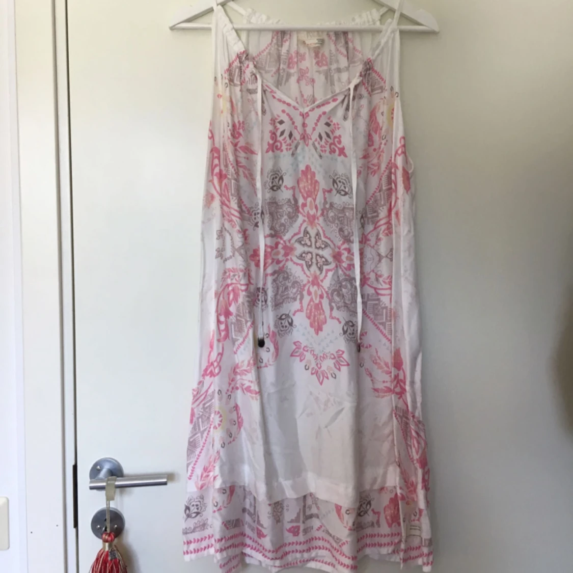 Rosa kort klänning med volanger - Säljer en söt rosa kort klänning med tunna axelband och volangdetaljer. Klänningen har prickigt mönster och är tillverkad i ett lätt, luftigt material som ger en skön känsla. Perfekt för varma dagar!!