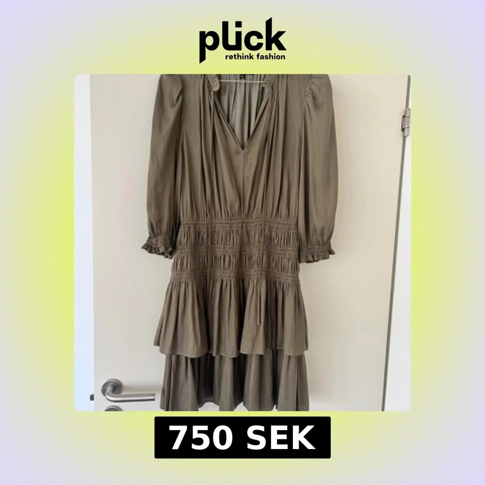 Supersöt olivgrön kortklänning från Maje med volanger, v-ringning och knytband vid halsen. Klänningen har långa ärmar med smock och volangdetaljer vid ärmslut samt flera lager i kjolen för en flowy look. Perfekt för dig som gillar en avslappnad men chic stil. Använd 1 gång