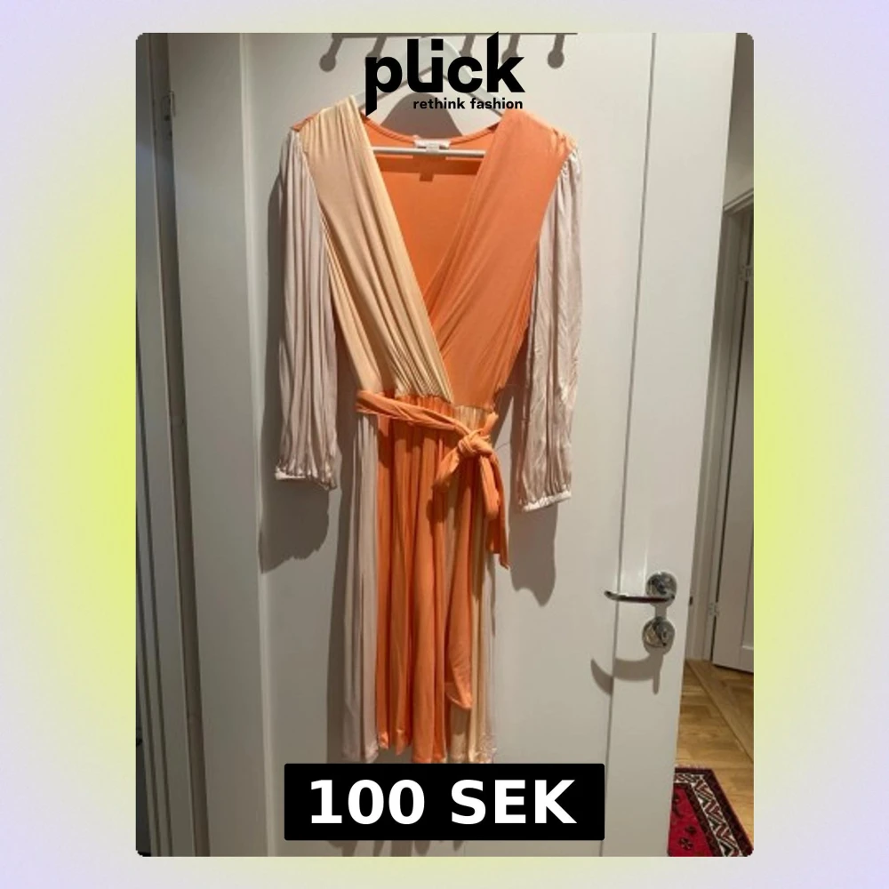 Snygg omlottklänning från Calvin Klein i ljus orange och beige med v-ringning och knytband i midjan. Klänningen har trekvartsärmar med lätt puff och är tillverkad i mjukt, följsamt material som ger ett skönt fall. Perfekt för dig som gillar färg och stil.