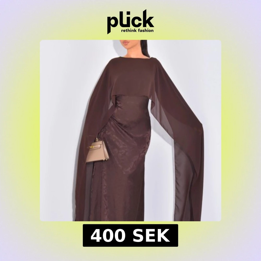HELT NY, EJ ANVÄND Elegant brun långklänning från Jeansindustry med svepande transparenta ärmar och snygg snörning i ryggen. Klänningen har en lätt glansig finish och figurnära passform, perfekt för dig som vill sticka ut med en dramatisk look. KÖPAREN STÅR FÖR FRAKT