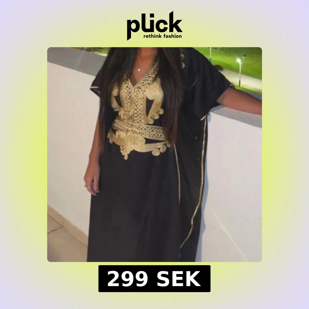 Elegant svart gandora med detaljerat guldbroderi framtill och vid midjan. Den har en v-ringad design och korta ärmar, vilket ger en sofistikerad look. Perfekt för speciella tillfällen.