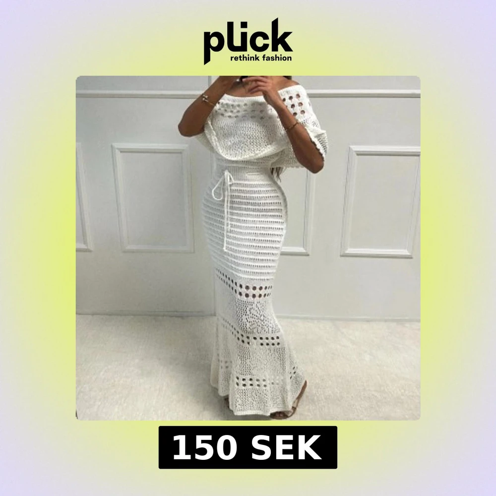 Superfin vit virkad långklänning med offshoulder och volang upptill i storlek ONESIZE från jeansindustry. Jag är en S/36. Klänningen har figurnära passform, knyt i midjan och snygga virkade detaljer som ger en bohemisk vibe. Perfekt för sommardagar och strandhäng.