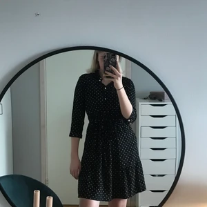 Svart prickig klänning! Storlek 38/M! Har använt den 1 gång för prövning! Band till midjan och knappar vid framsida mage! Leverans står för säljaren!