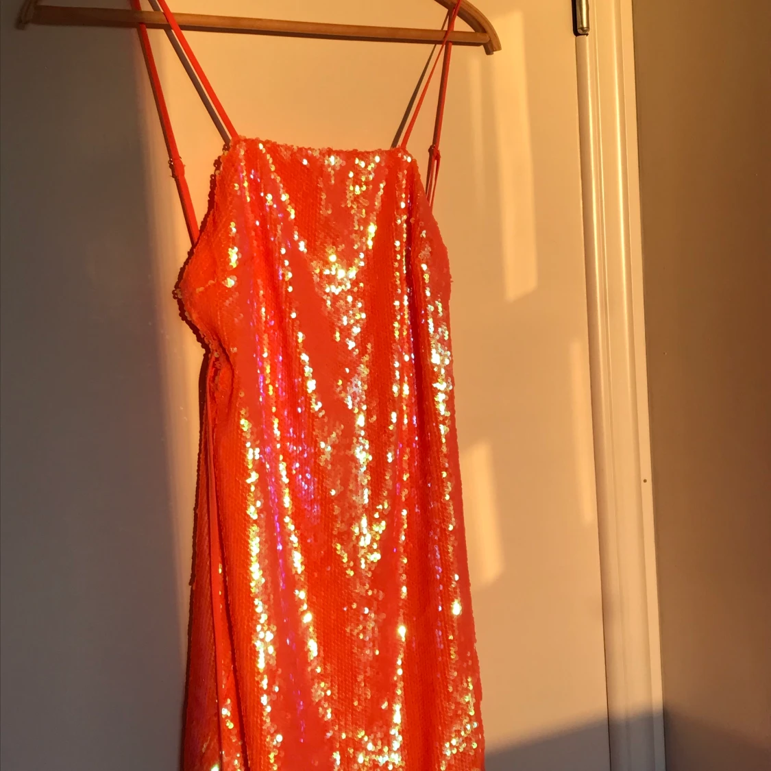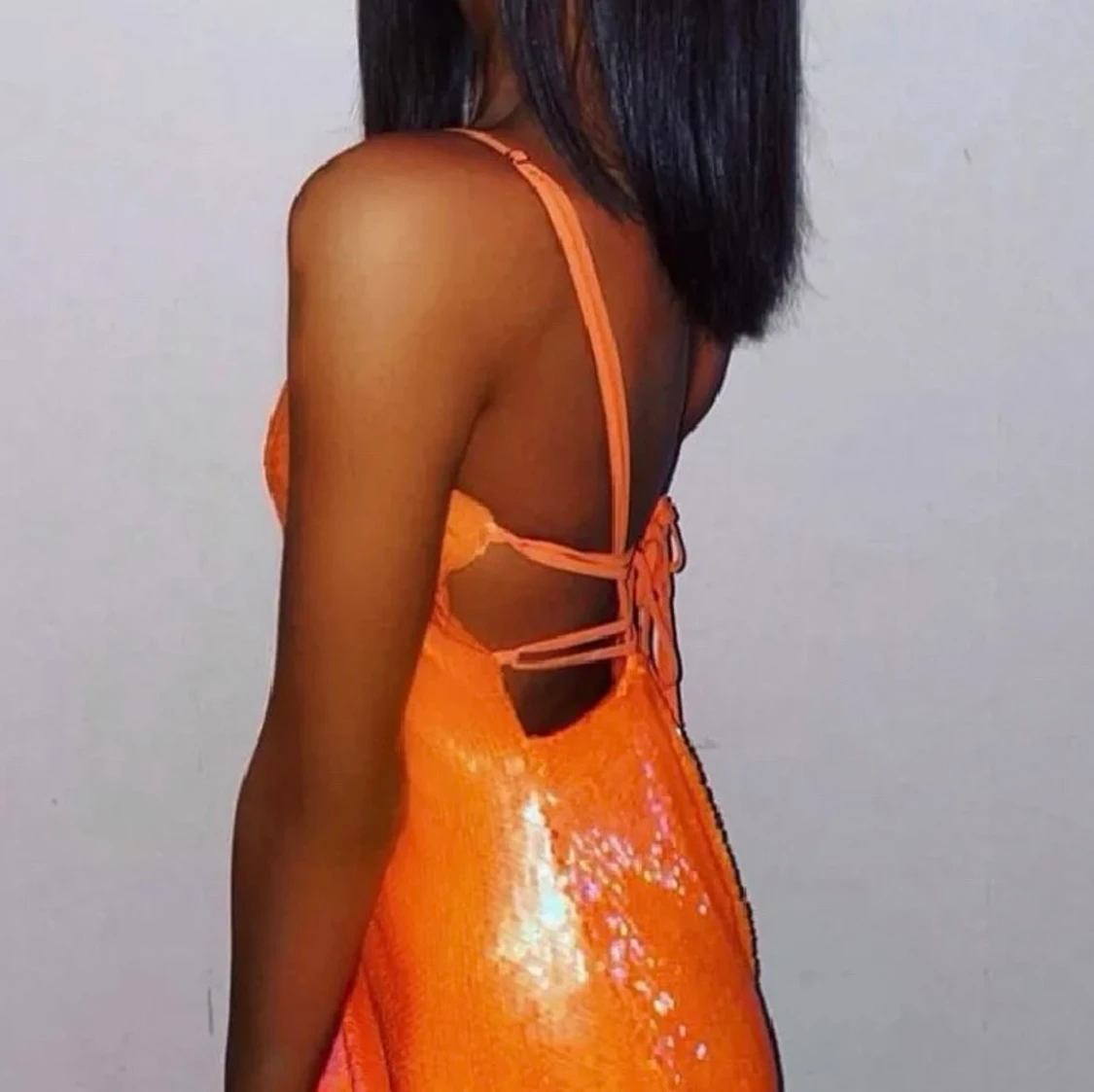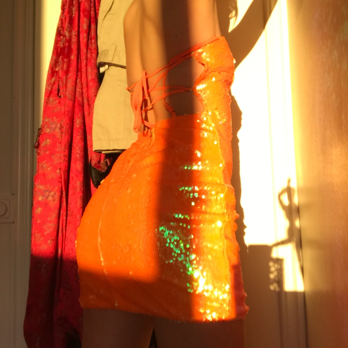 världens häftigaste miniklänning i orange men som får dig att verkligen synas! Den har justerbara band och kan spännas åt i midjan. Öppenryggad vilket är skitsnyggt och snygg snörning. Va huvudkaraktären och kööööp! Första bild lånad av hon ja köpte den av på plick. ja är str S, 175cm och den är ej för kort