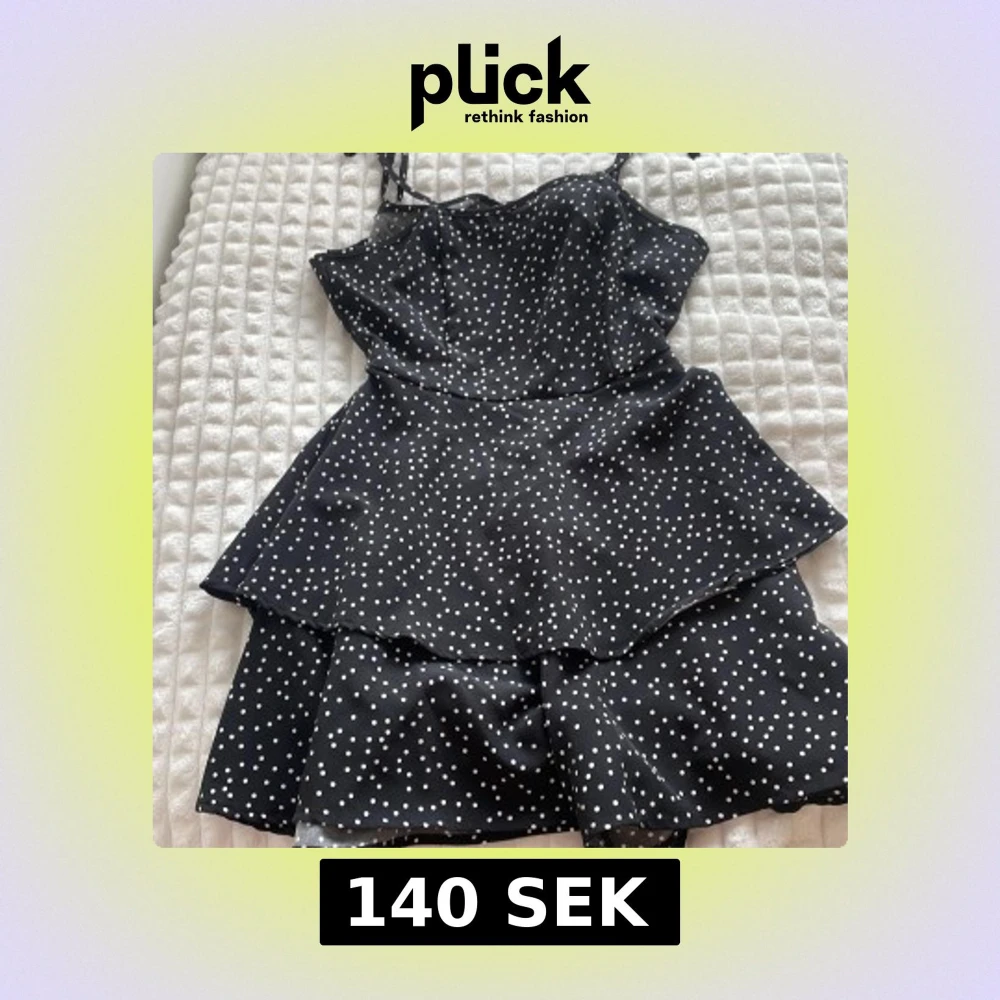 En svart klänning med vita prickar i storlek XXS. Den är i nyskick och har aldrig använt den då den är för liten i bysten(därav har ja inga bilder). Man knyter den i ryggen och det är shorts nere som man inte ser när man har på sig klänningen eftersom det blir volangigt nertill. Jag har fått klänningen av min kusin💕💕💕