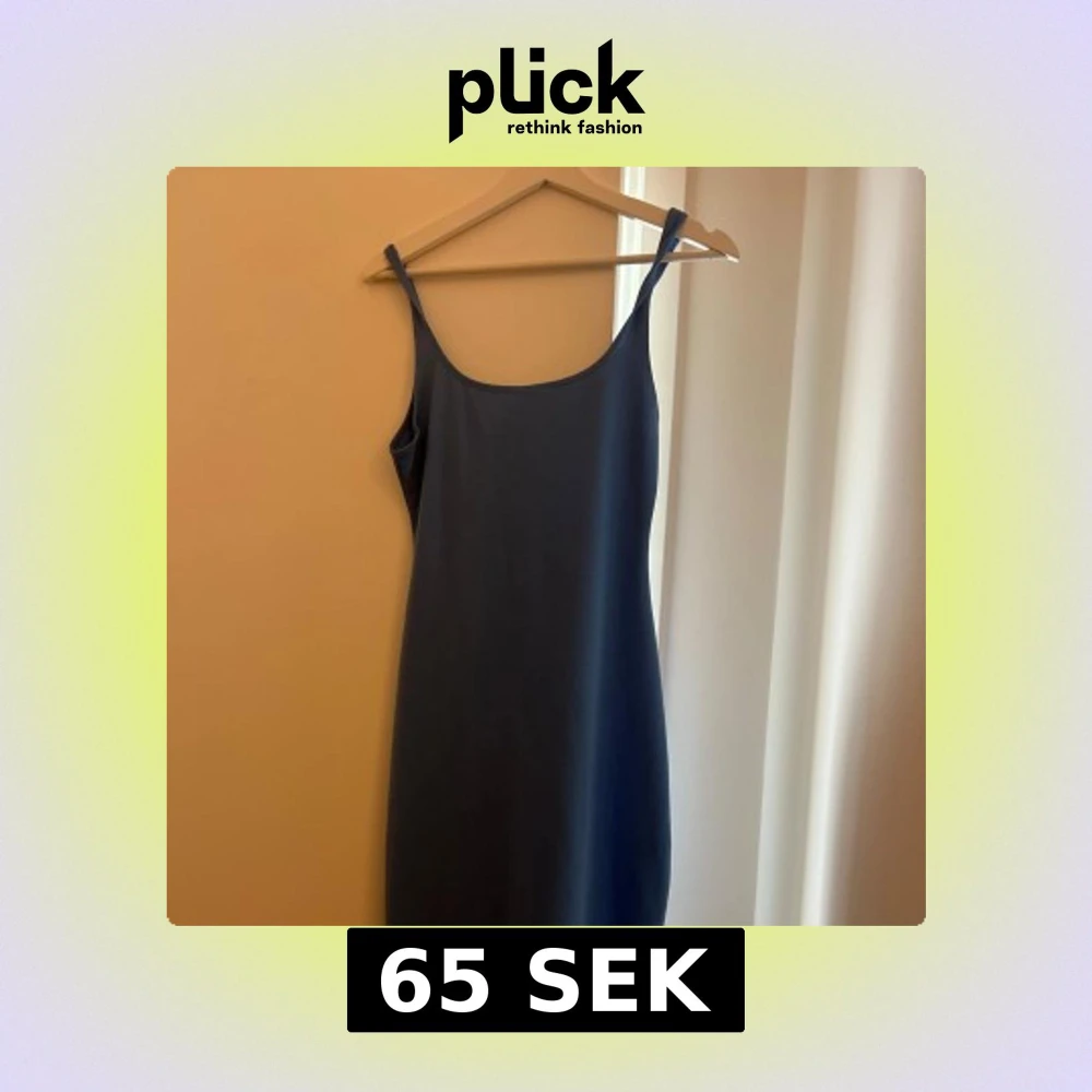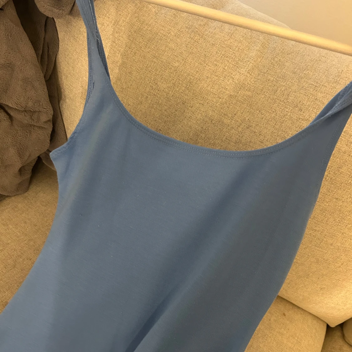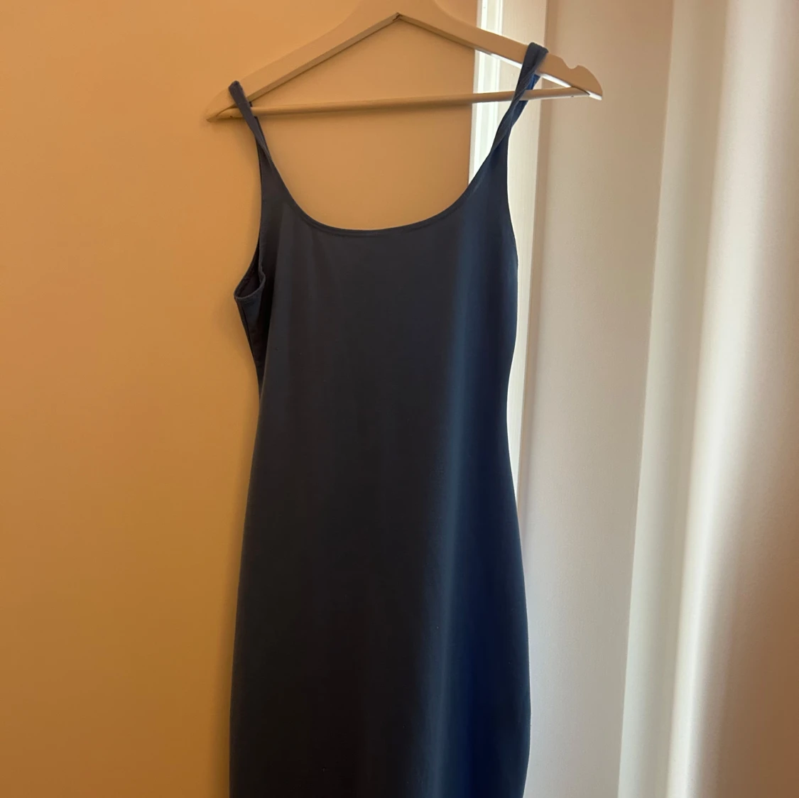 En stilren ljus blä långklänning med smala axelband och enkel, rak passform. Klänningen är ärmlös och har en mjuk, något stretchig känsla som gör den bekväm att bära. Aldrig använd och slutar precis under knäna.