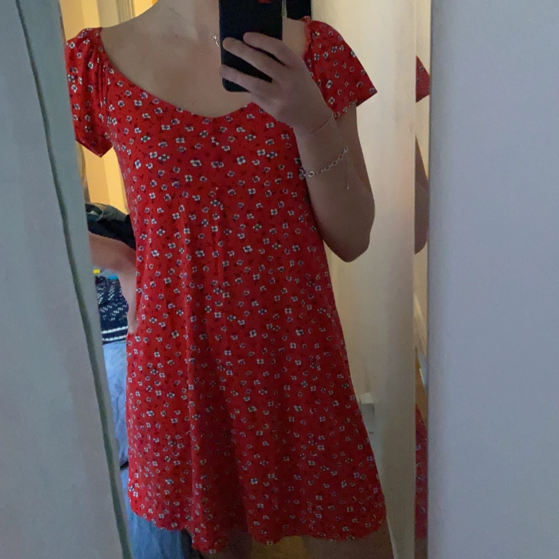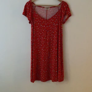 En röd sommarklänning från Pull & Bear, slutar en bit över knäna, söta detaljer med dekorativa knappar, söt enkel ”urringning”, man kan ha den som off-sholder eller bara som den är. Storlek S men är rätt så töjbar och skönt material. Endast använd ett fåtal gånger!❣️