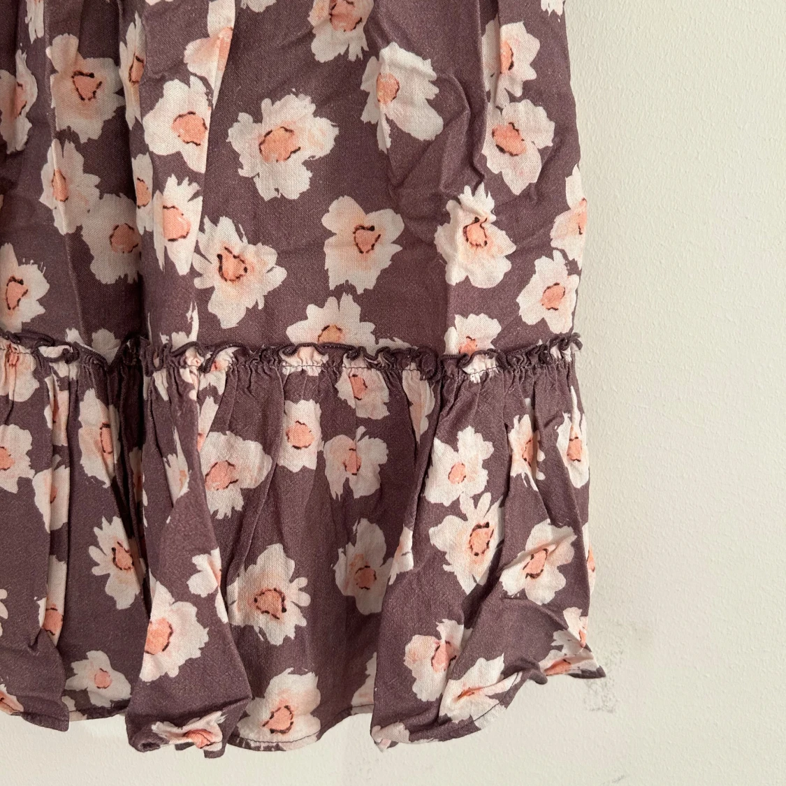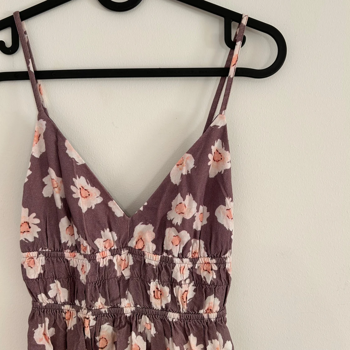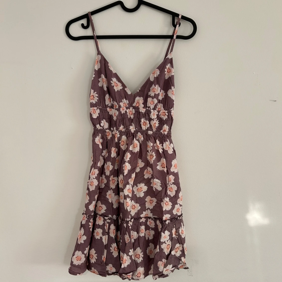 Supersöt lila kortklänning med blommor, smala axelband och v-ringad hals. Klänningen har smock i midjan och volang nedtill. Materialet känns lätt och luftigt. Storlek xs, liten i storleken.