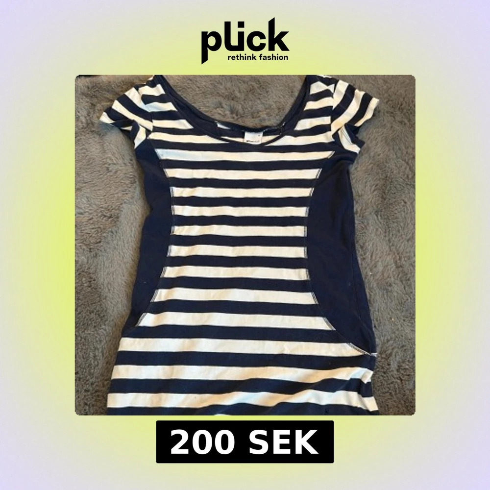 Superfin kortklänning från Gina Tricot i marinblått och vitt med klassiskt horisontellt randigt mönster. Klänningen har rund halsringning och korta ärmar. Perfekt för en avslappnad och stilren look.
