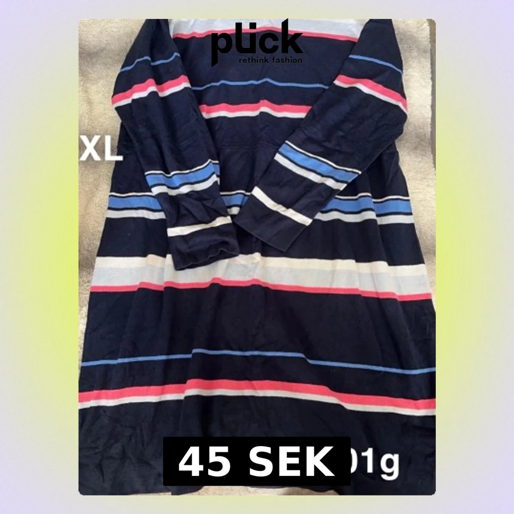Mysig långärmad klänning i marinblått med breda ränder i vitt, blått och rött. Klänningen har en avslappnad passform och är perfekt för dig som gillar en enkel men färgglad stil. 🌸 Några fläckar och noppor. Storlek XL