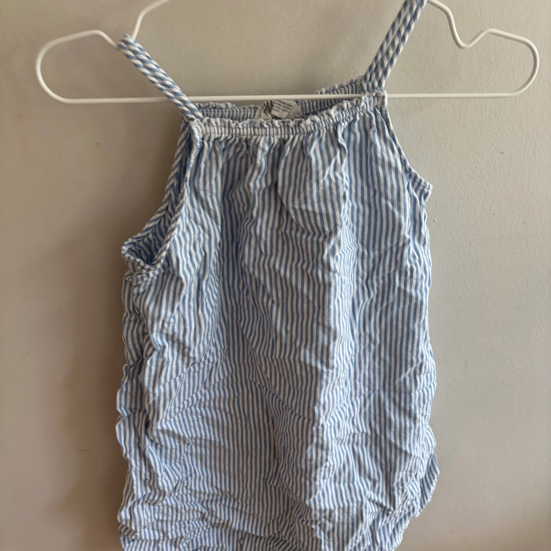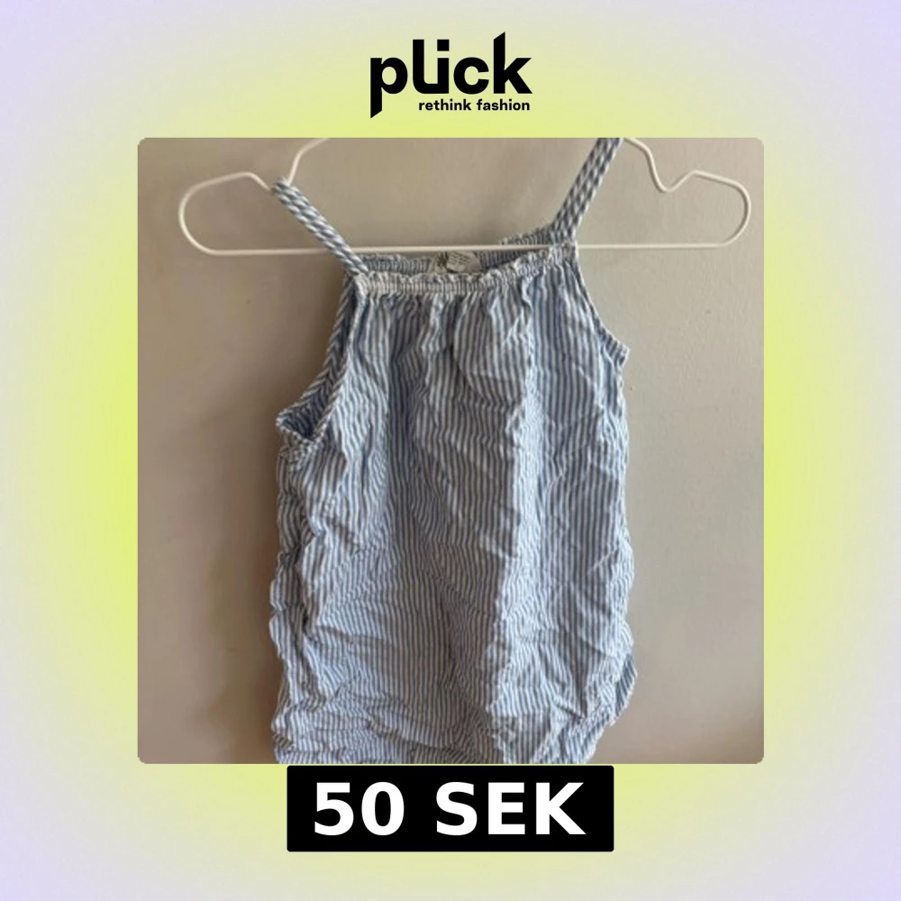Söt kortklänning från H&M med smala axelband och blåvita ränder. Tillverkad i mjuk bomull, perfekt för varma dagar. Lätt och luftig modell med avslappnad passform och elastisk halsringning.