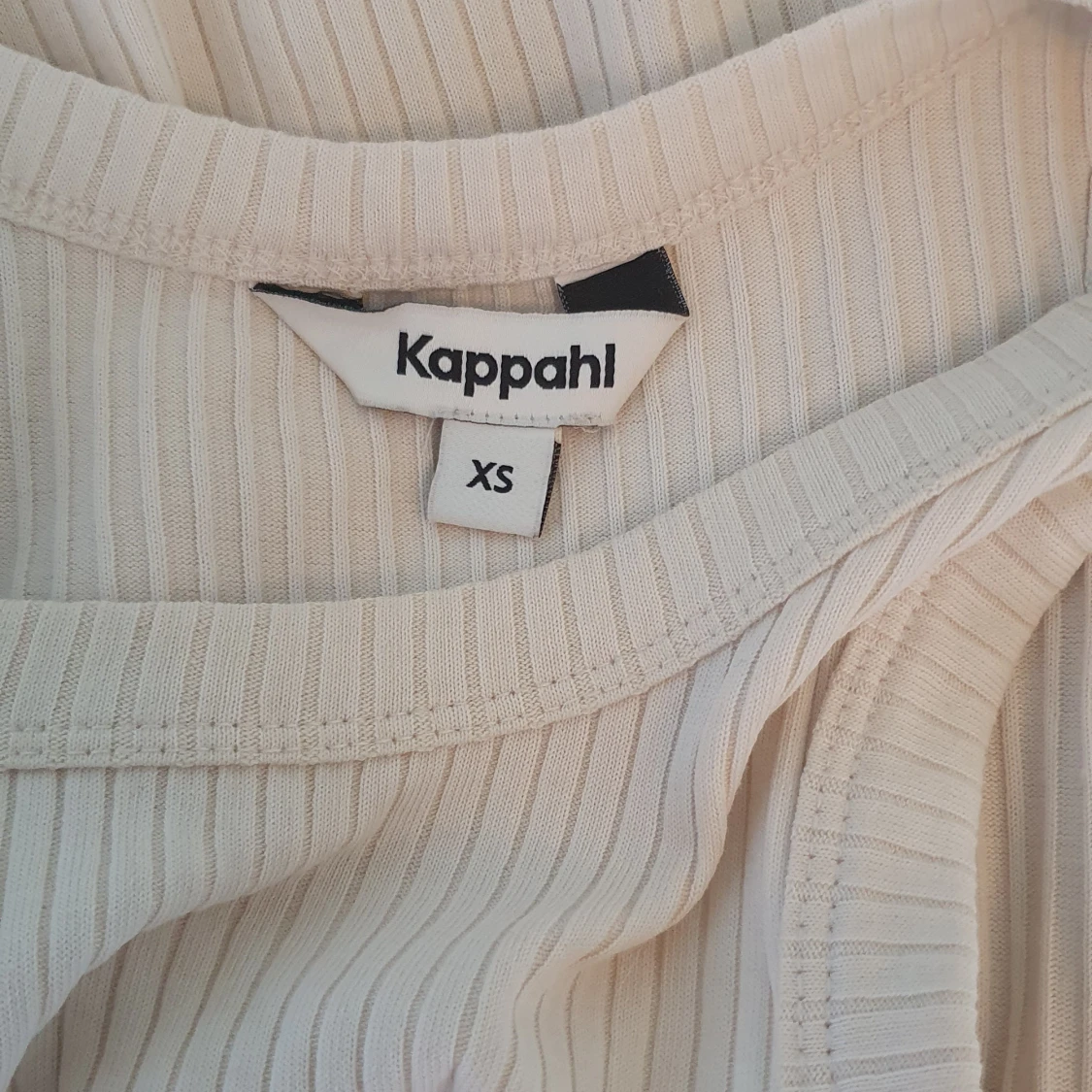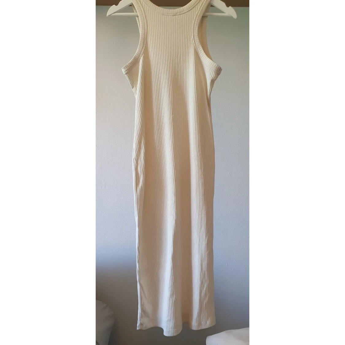 Lång, ribbad klänning från Kappahl i en ljus beige ton. Ärmlös modell med rund halsringning och figurnära passform. Tillverkad i mjuk mix av polyester och bomull, perfekt för en clean och stilren look.