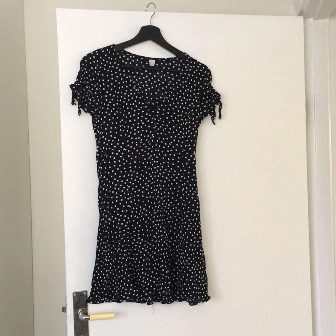 Jättesöt kort prickig svart viskose klänning från Hm. Med knappar, smickrande skärning. Strl 42 men krympt i tvätten, mer som strl 38. Knappt använd, som ny