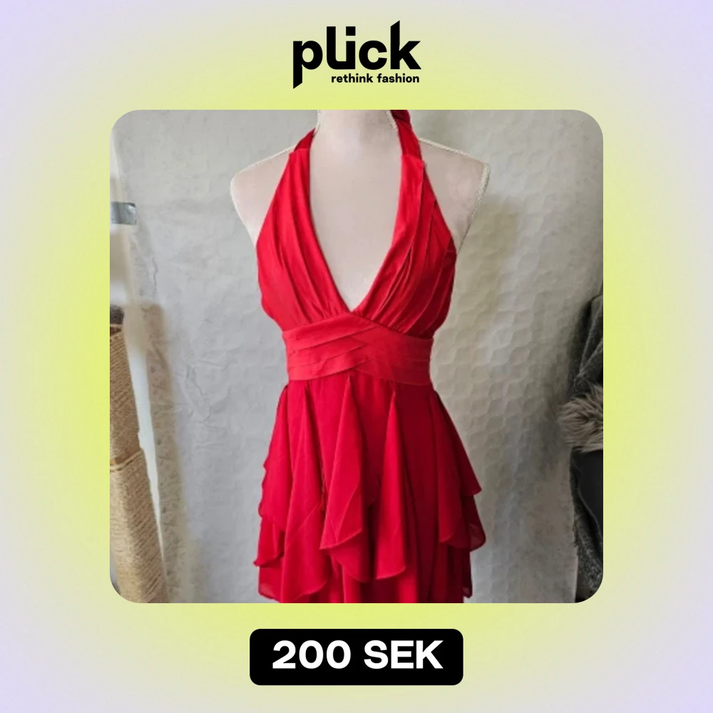 En elegant röd klänning med volanger och halterneck-design. Klänningen har en omlott-detalj vid midjan och en v-ringad hals. Den är tillverkad av 100% polyester och har en dragkedja på baksidan.