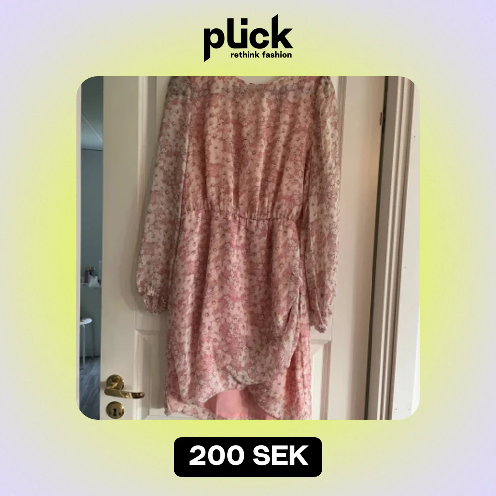 En blommig klänning med långärmade ärmar. Klänningen har en rosa och vit färgkombination med ett blommönster. Den har en lös passform och är tillverkad i ett lätt material. Aaknas en knapp på baksidan, men inga problem för den som kan sy