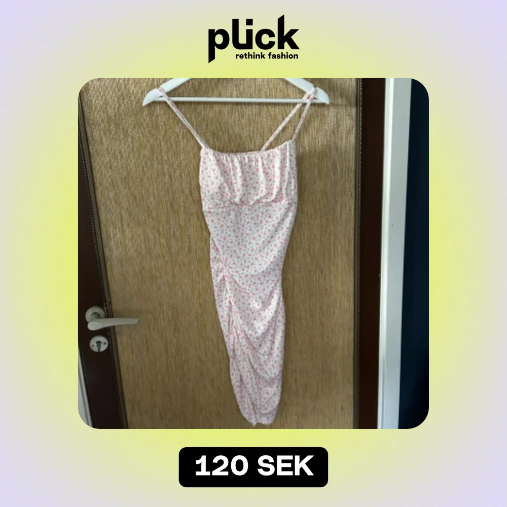 Säljer en superfin klänning med smala axelband. Klänningen är vit med ett sött blommigt mönster i rosa och grönt. Perfekt för sommarens alla fester eller bara en härlig dag i solen. Den har dubbeltyg vid bysten och är ungefär knälång. Passar perfekt för en romantisk look! 🌸