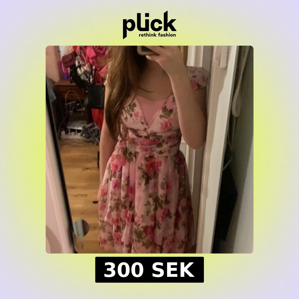Charmig rosa klänning med blommigt mönster och omlott-design. Den har korta ärmar och en v-ringad hals. Perfekt för sommarens festligheter. ❤️storlek M men passar även xs och s man kan välja hur hårt man väljer att knyta den❤️