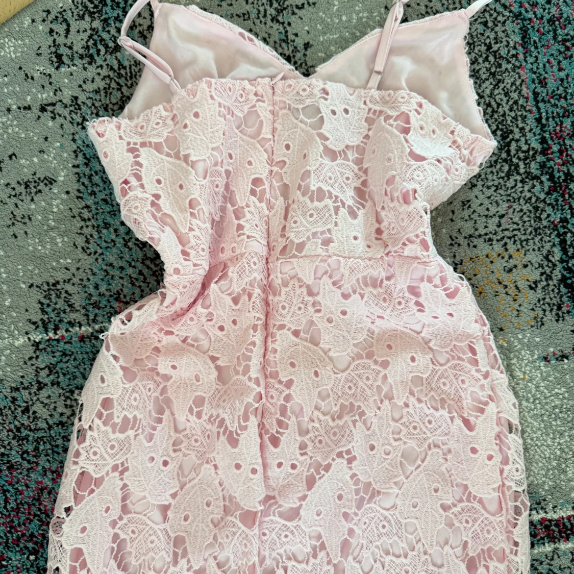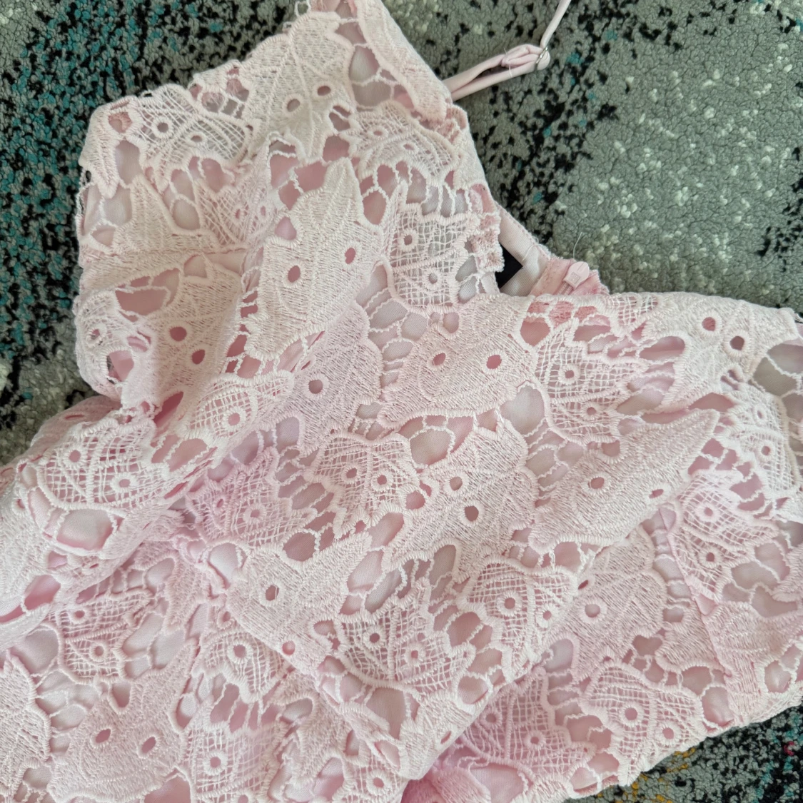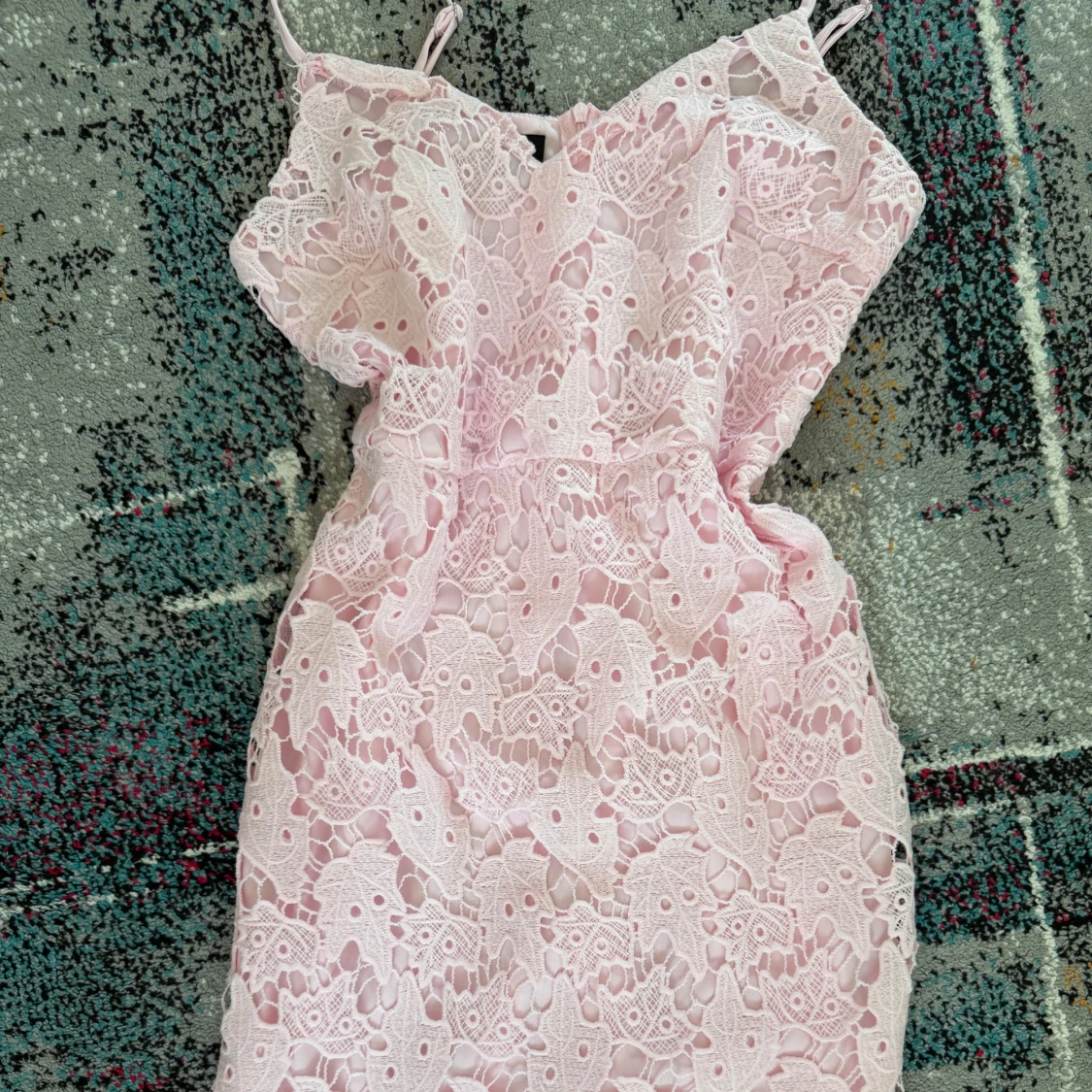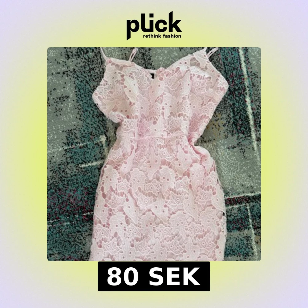 Supersöt ljusrosa kortklänning med tunna axelband och volang upptill. Klänningen har ett vackert spetsmönster och är fodrad undertill. Perfekt för sommarens alla tillfällen. Köpt på shein för 300kr och har aldrig använts. Pris kan diskuteras