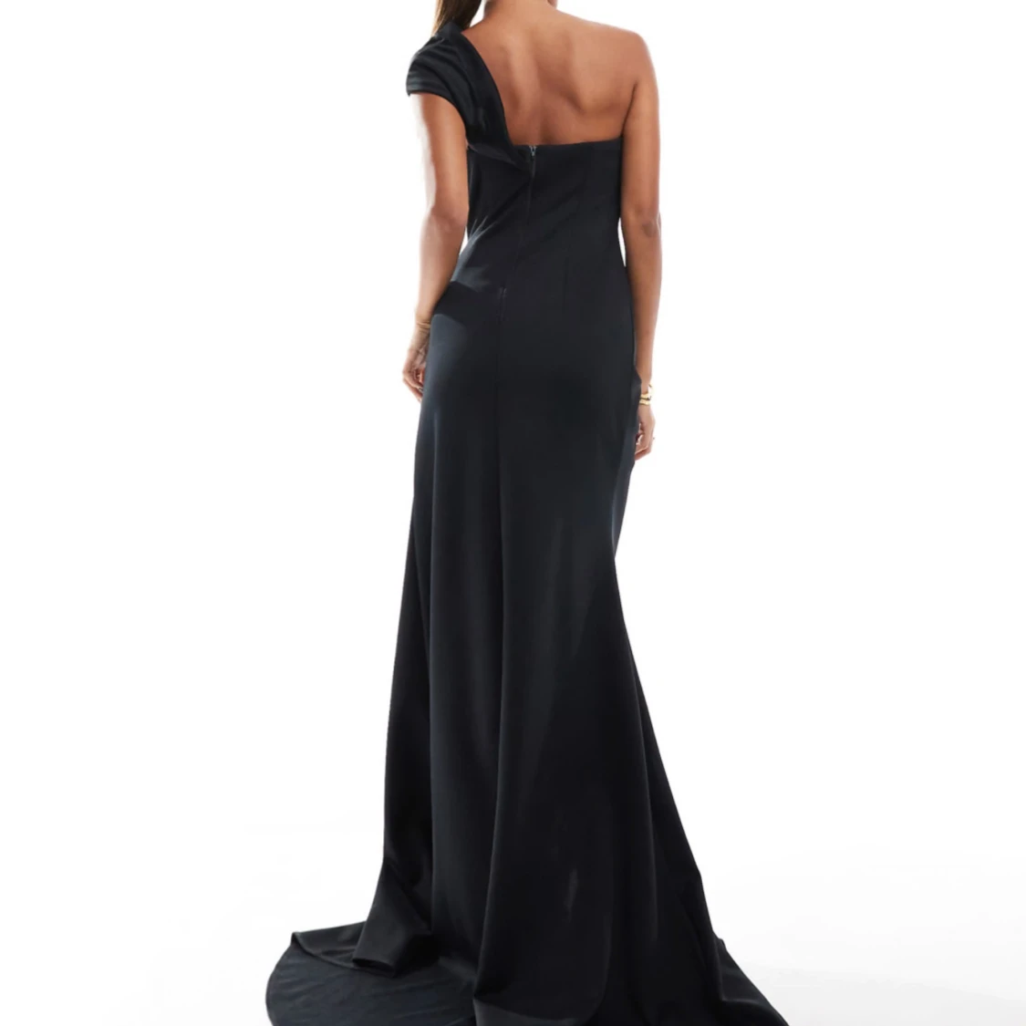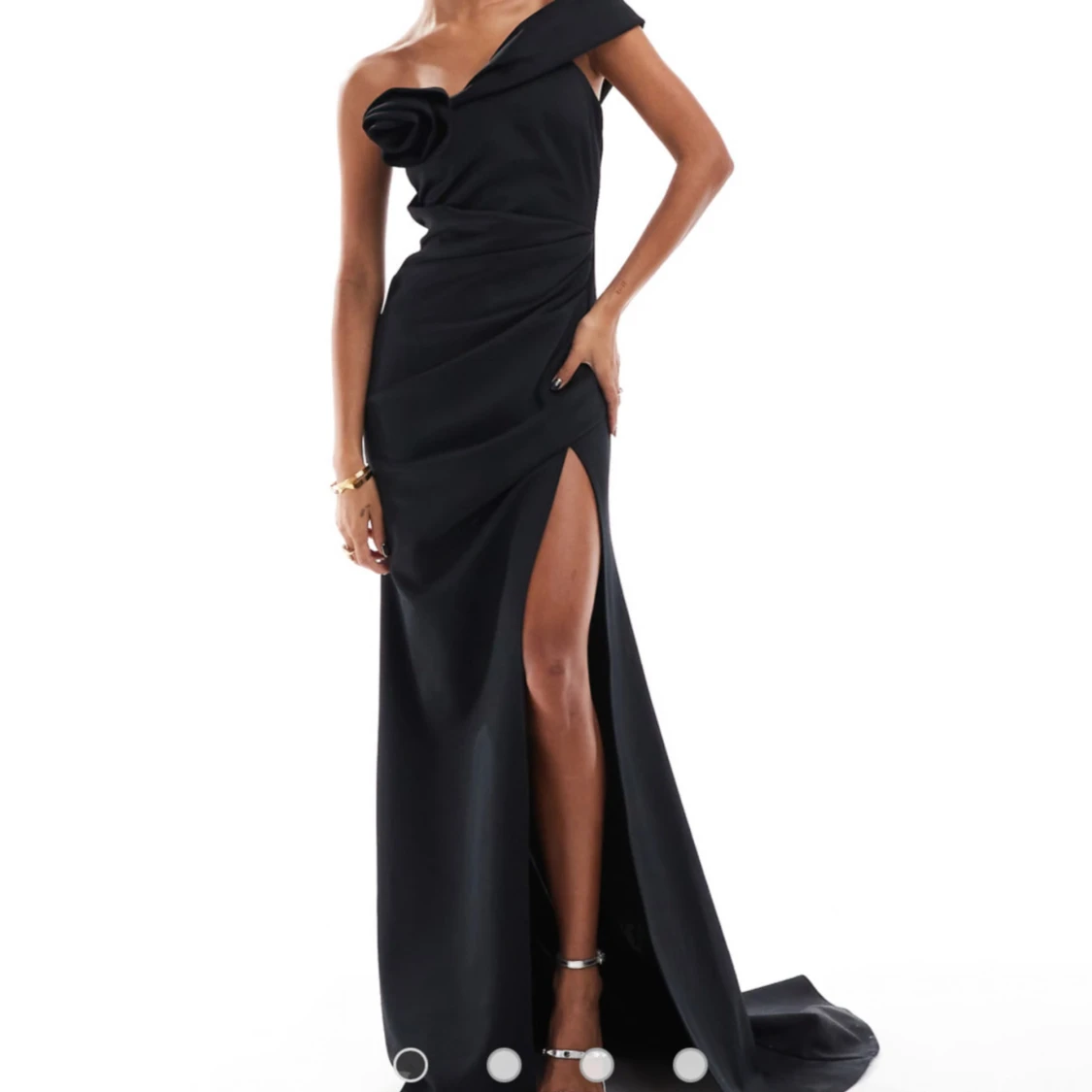 Elegant svart oneshoulder klänning med en stor rosdetalj på axeln och slits. Storlek 36. Slutsåld på ASOS. Ord pris 1349kr.