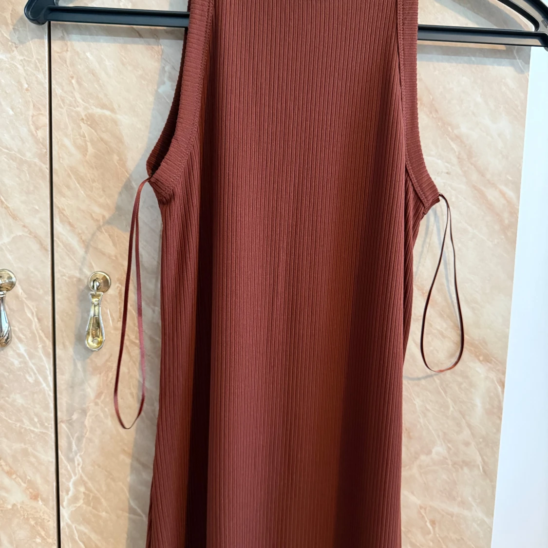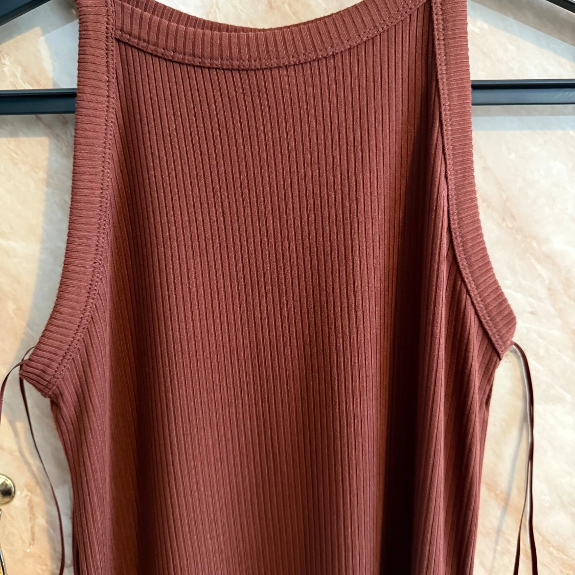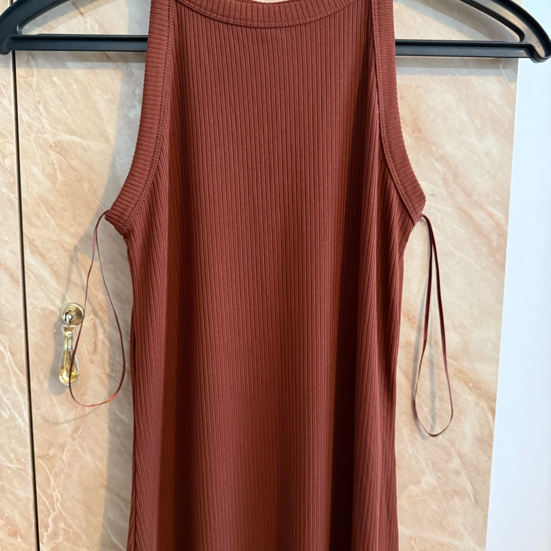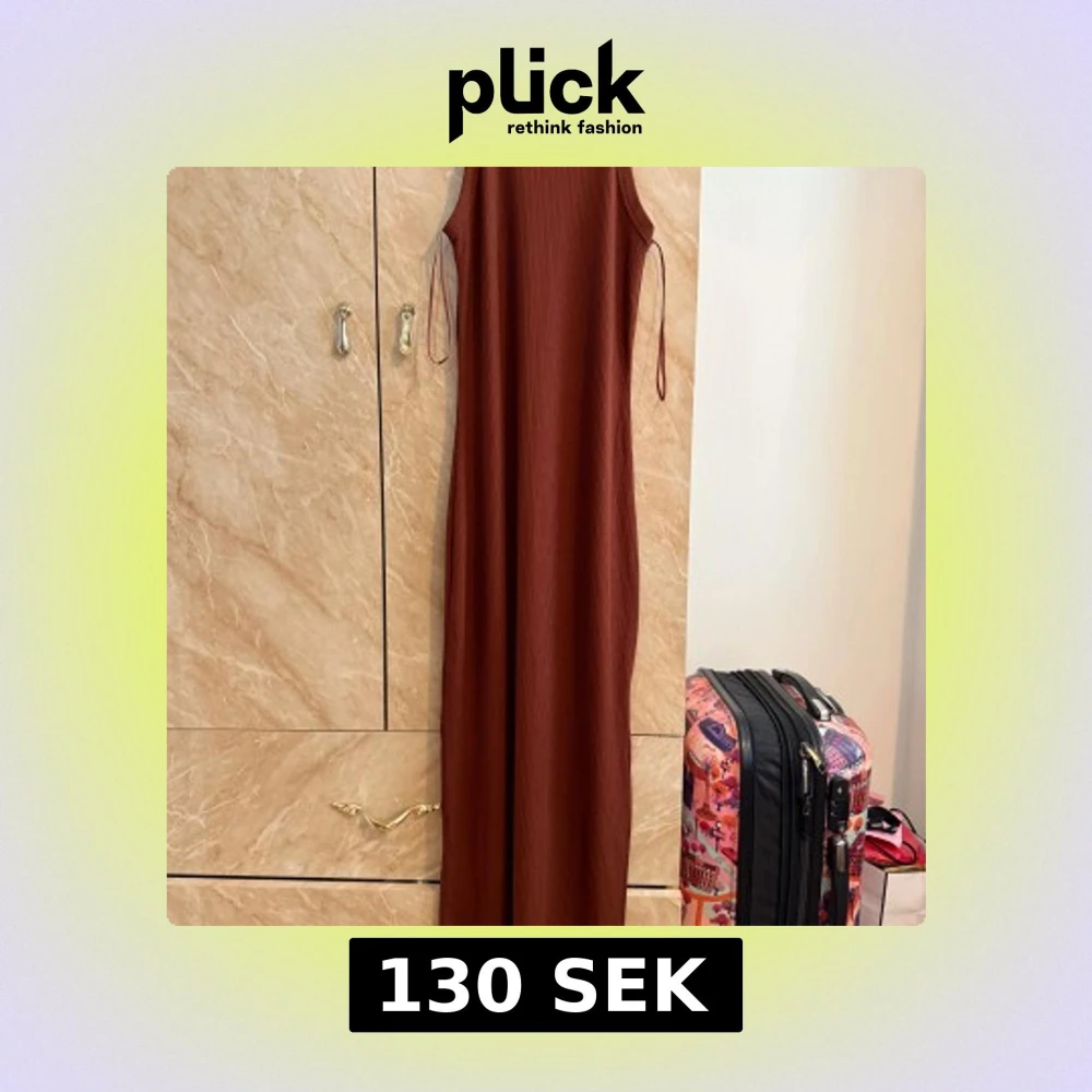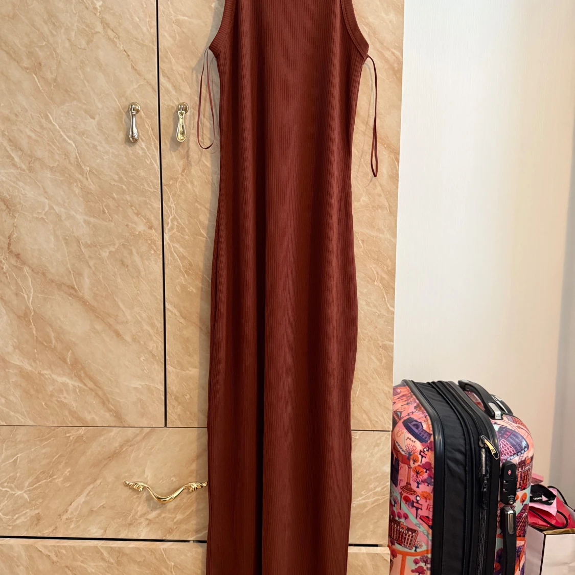 Säljer en ärmlös långklänning i rostbrun färg med ribbad struktur. Klänningen har smala axelband och elastisk tyg, vilket kan fungera som size S-M.