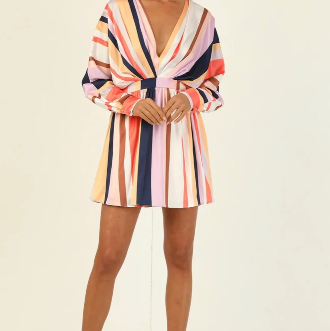 Perfekt för skolavslutning eller bröllop! Randig satinklänning med långa ärmar. Köpt på Runwayscout.com (Australien). Så fin kvalitet. Säljer pga att jag beställde två storlekar. Denna är i strl 8 (36). Dragkedja bak. Nypris: 600kr + tull från Australien