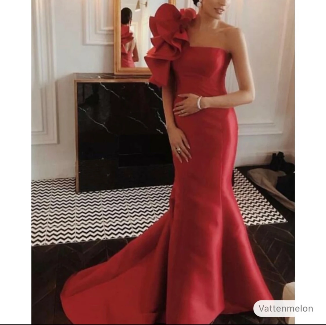 Säljer en galet snygg röd långklänning med en stor volangdetalj på ena axeln. Klänningen är axelbandslös på ena sidan och har en figurnära passform som breddas nedtill. Perfekt för dig som vill sticka ut och göra ett statement på bal eller fest.
